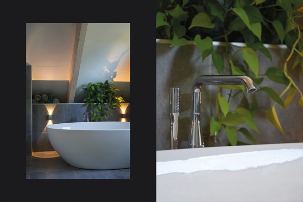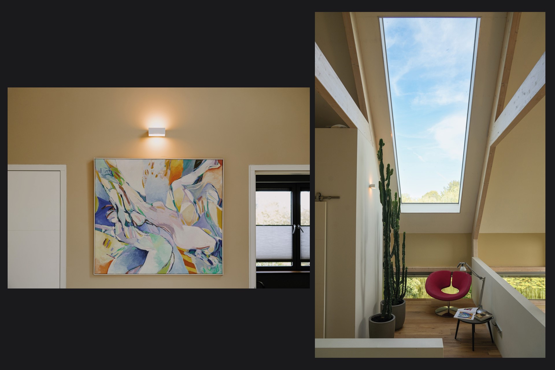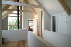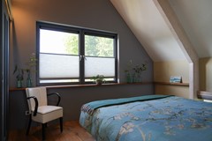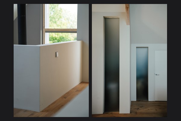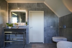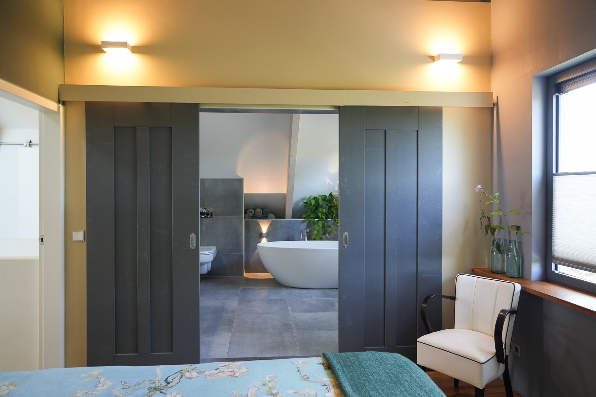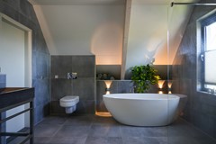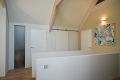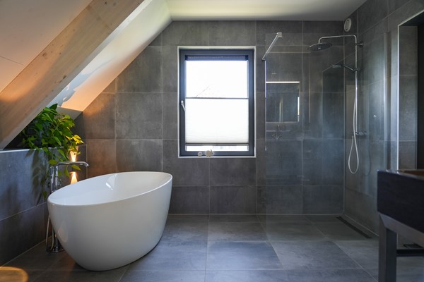 De eerste verdieping is verrassend licht dankzij een grote vide en royale dakramen. De ruime overloop biedt plek voor een zitje of werkplek. Er zijn twee slaapkamers, waarvan de ouderslaapkamer is voorzien van een inloopkast en een ensuite badkamer. Deze badkamer heeft een vrijstaand bad, inloopdouche, toilet en een natuurstenen wastafel met stijlvol rvs-meubel. Alles is ook bereikbaar vanaf de overloop. De tweede slaapkamer heeft een spectaculair groot dakraam met uitzicht op de dijk. Langs de overloop loopt een brede kastenwand met volop bergruimte.