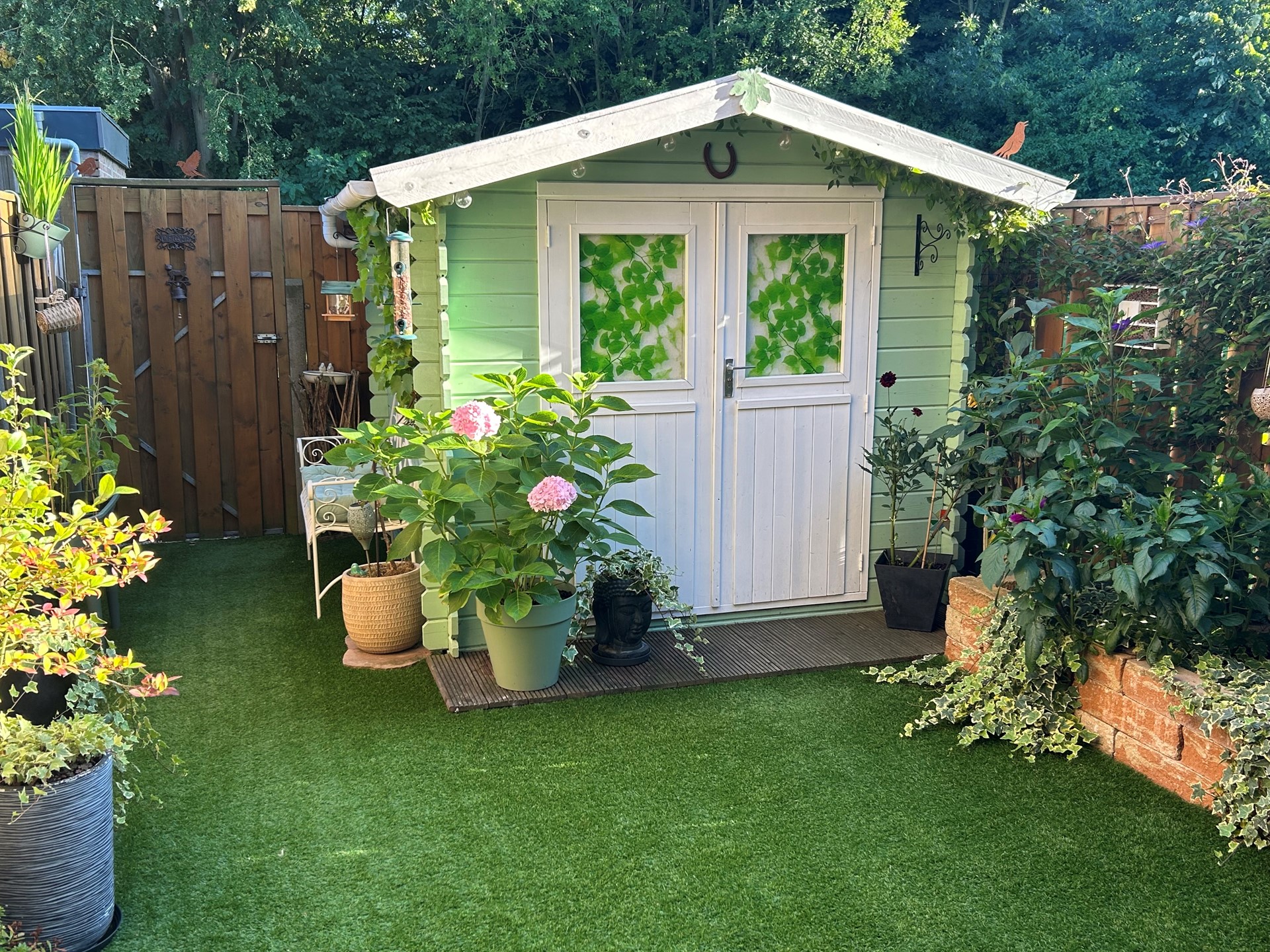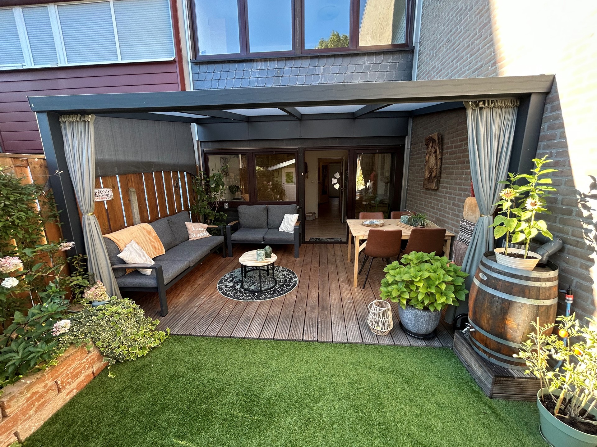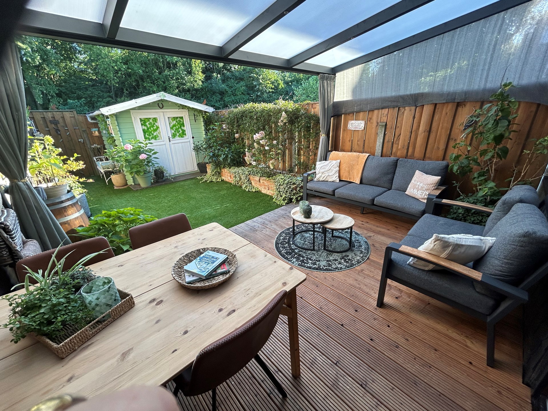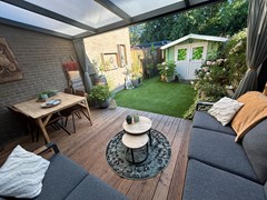Achtertuin 10,10 x 4,40 met terras met overkapping 4,40 x 3,05 met verlichting, kunstgras, houten schuttingen, muur, houten tuinhuisje 2,25 x 2,25 en achteringang.