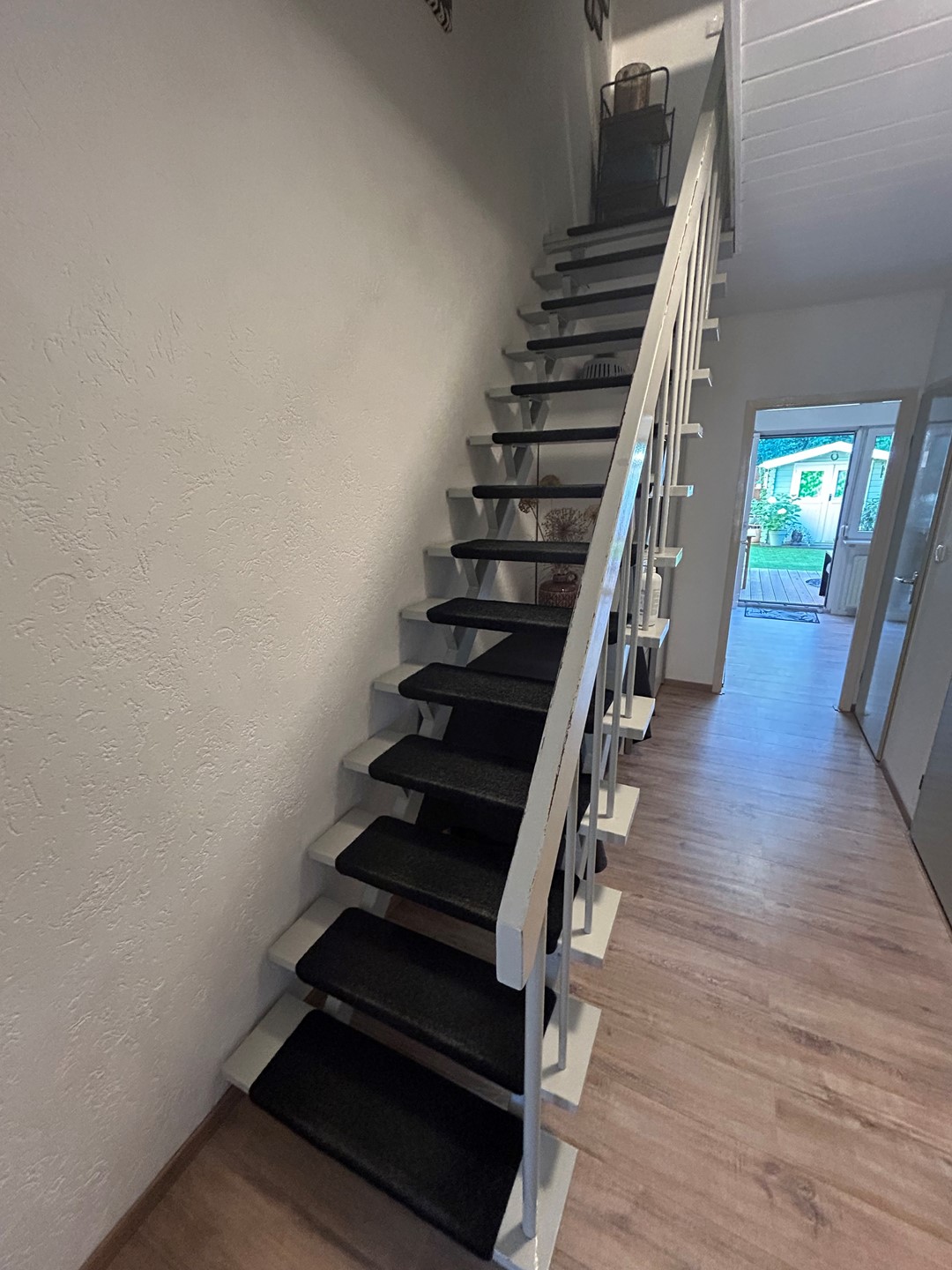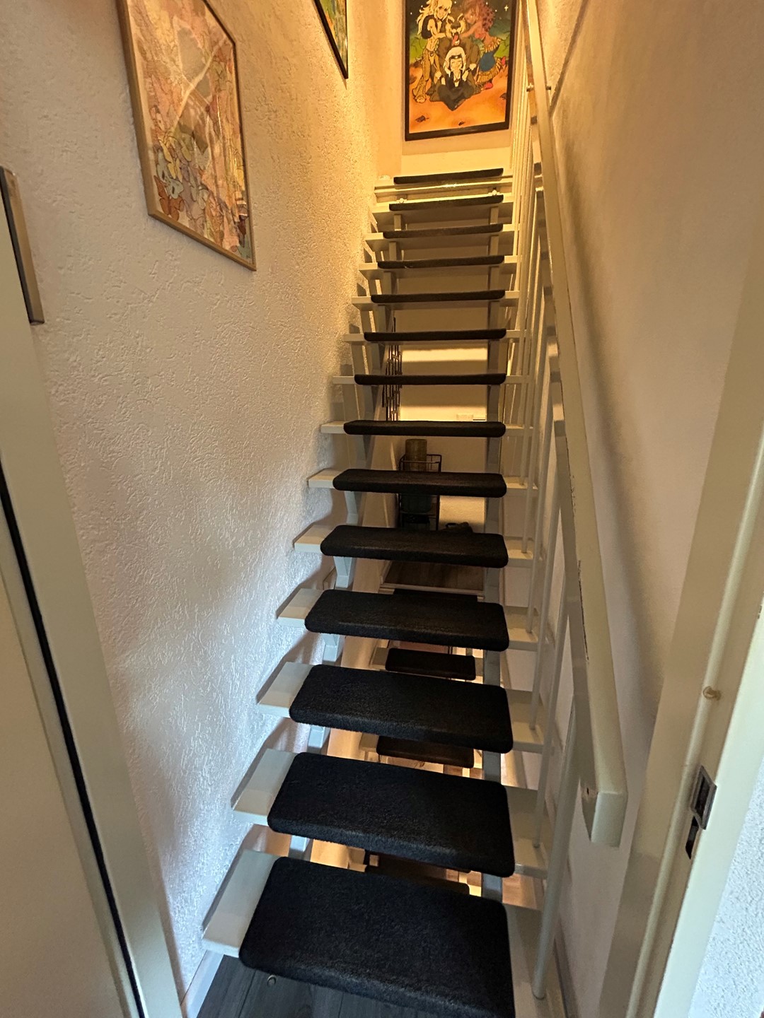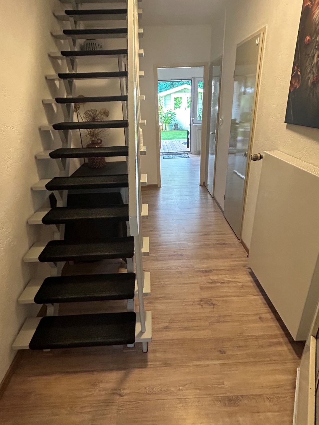Gang 4,45 x 1,90 met laminaatvloer, deur naar stookruimte, toilet, slaapkamer/tuinkamer en open trap naar verdieping.