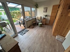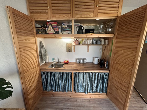 Slaapkamer/tuinkamer 4,35 x 2,95 met laminaatvloer, inbouwkast met keukenblok en schuifpui naar achtertuin.