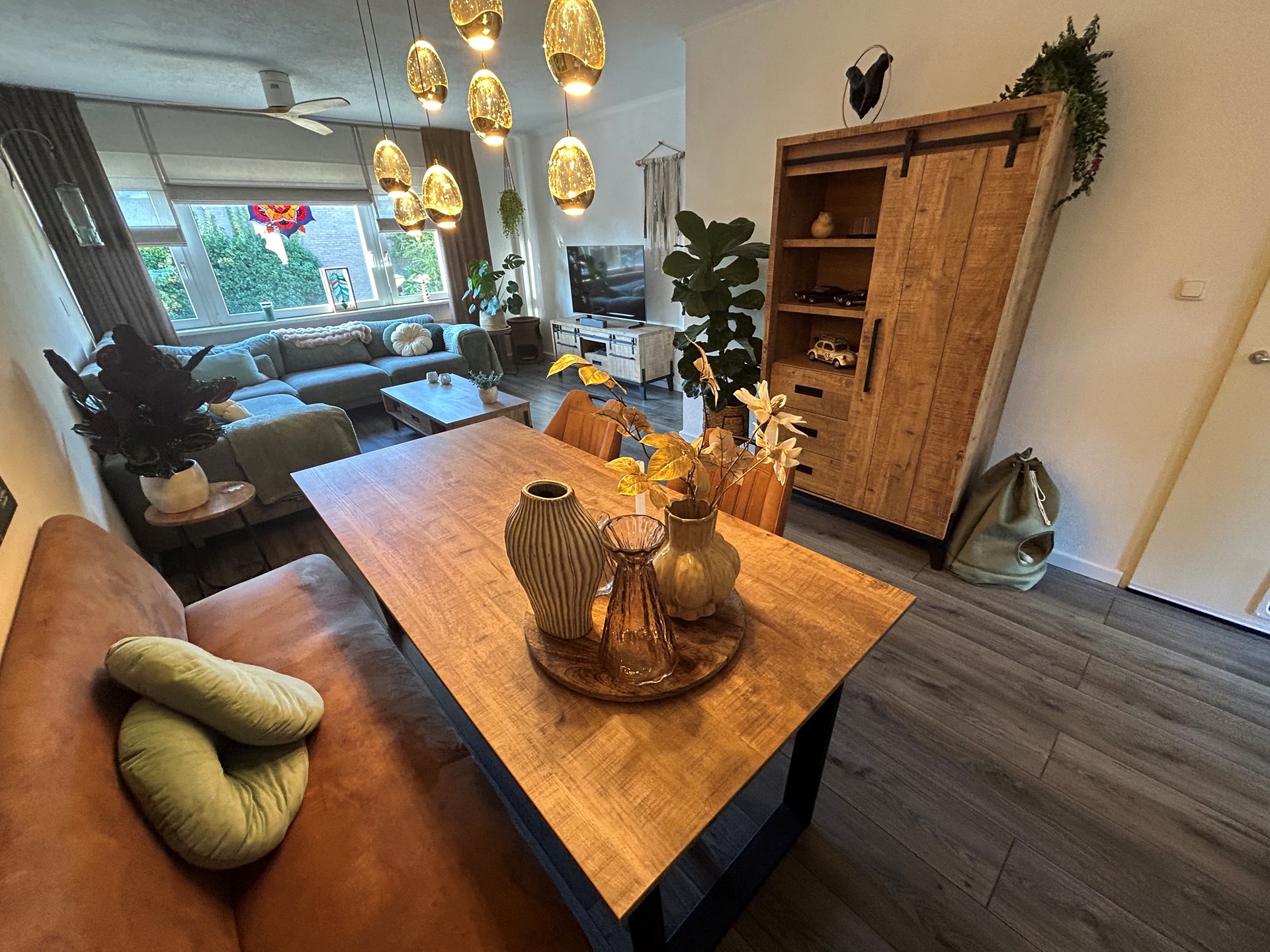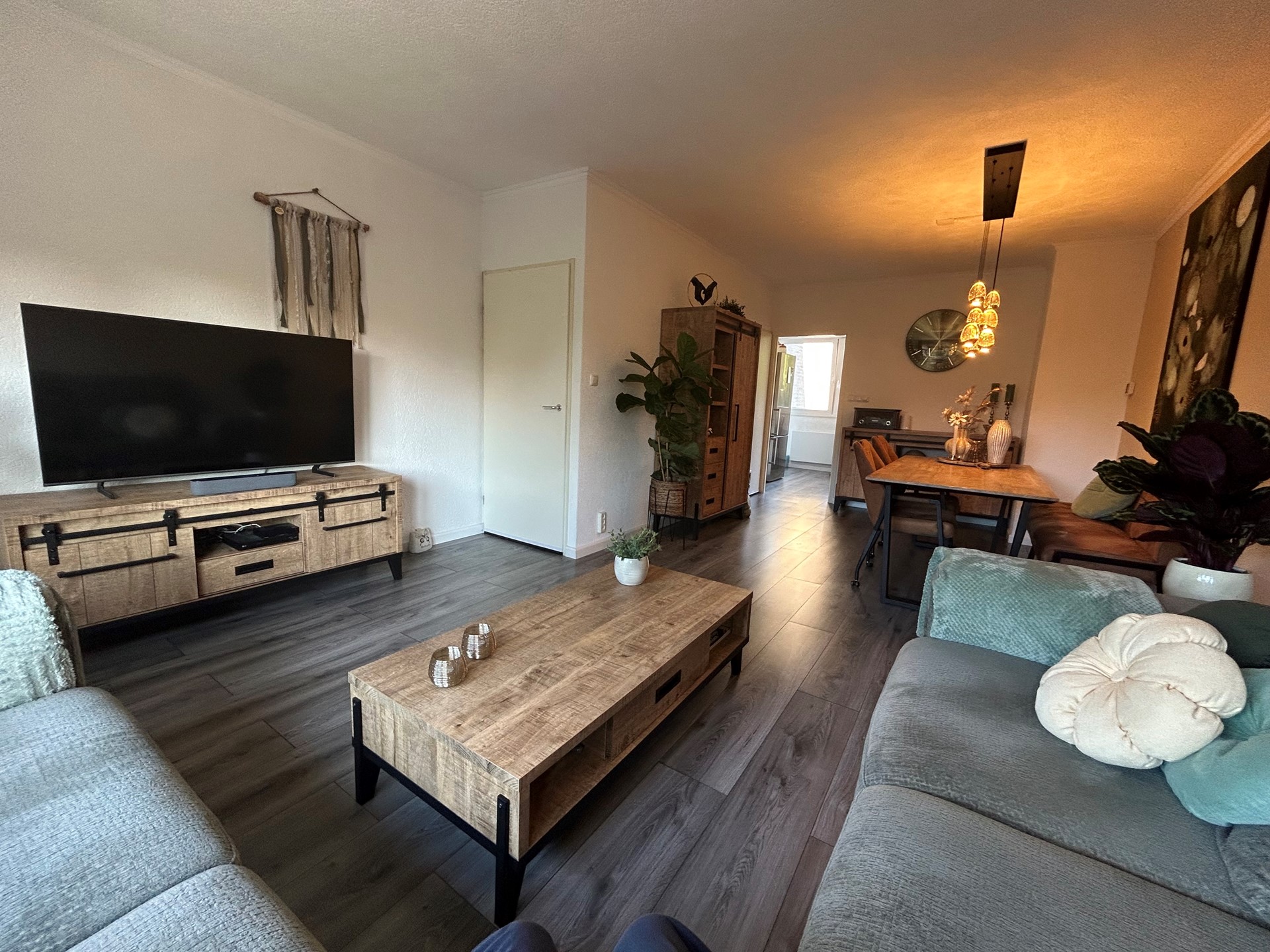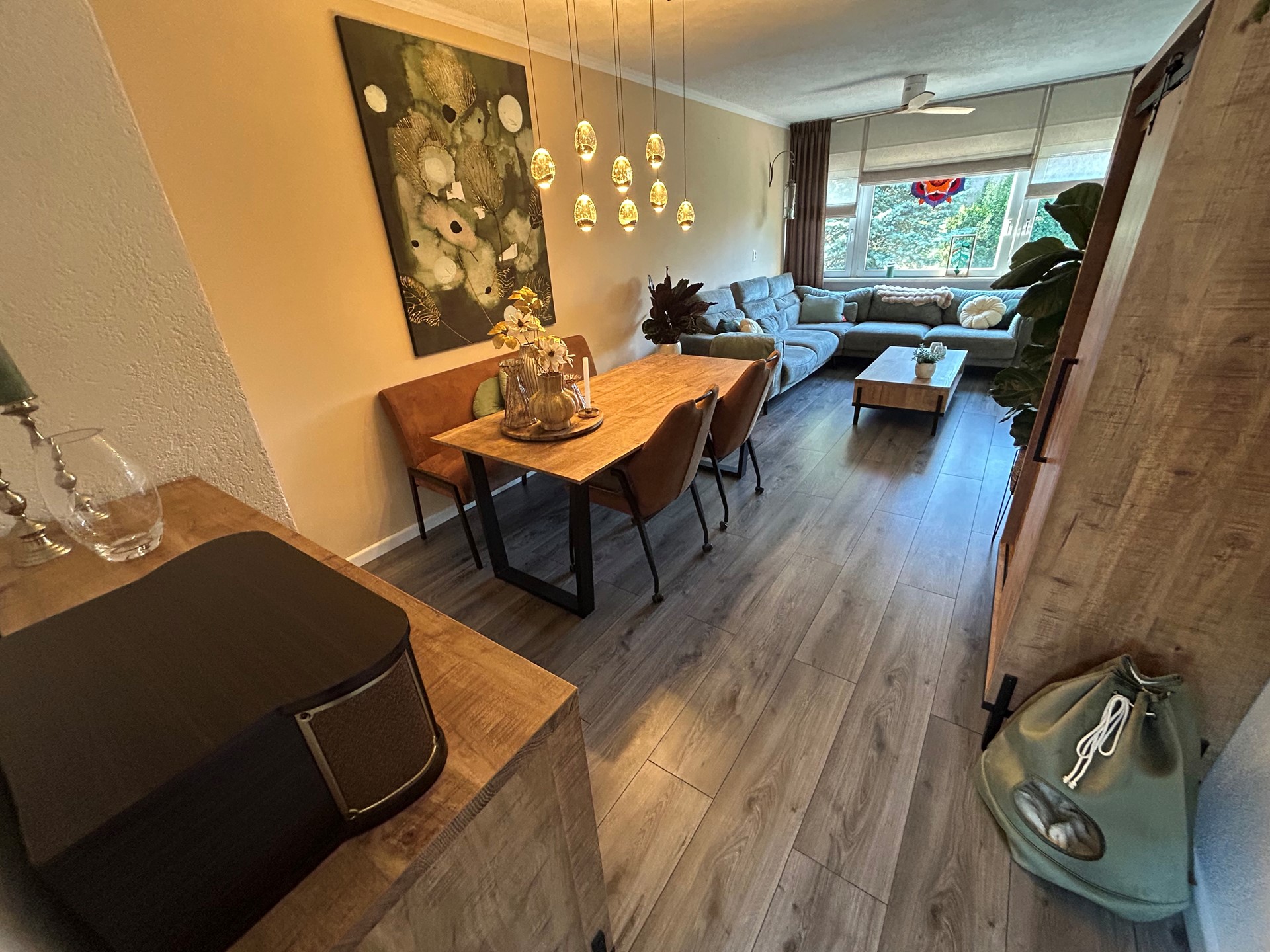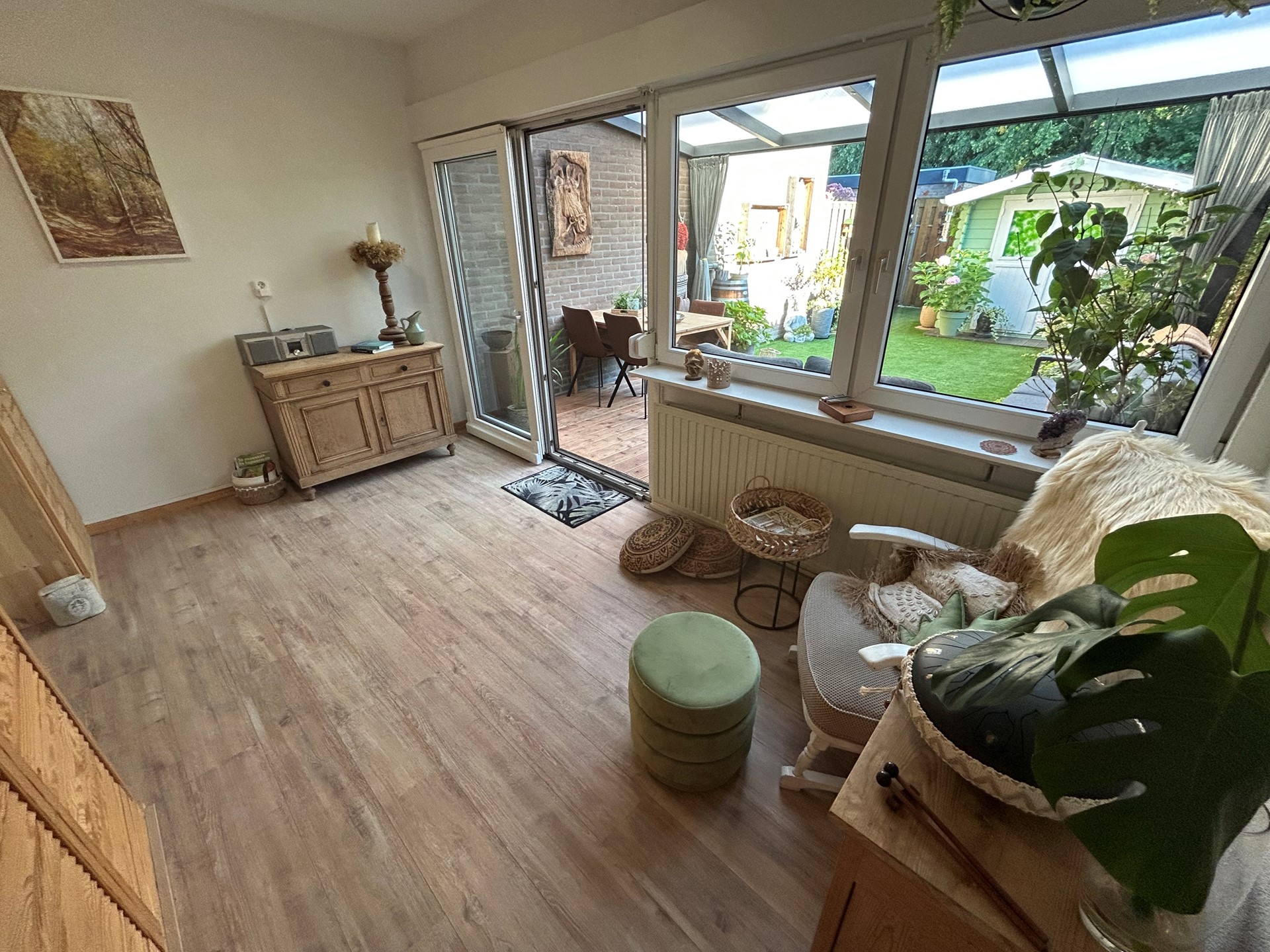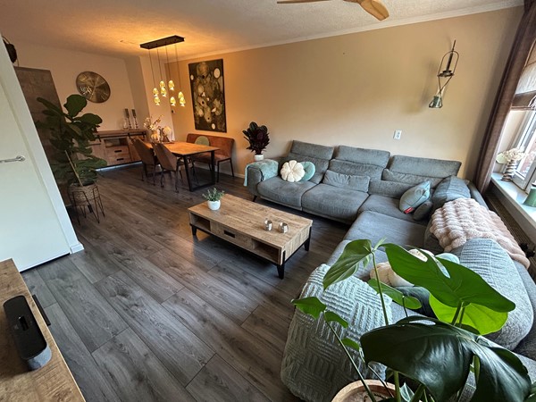 Ruime woonkamer 7,50 x 4,30/3,30 met laminaatvloer, doorgang naar keuken en deur naar open trap naar tweede verdieping.