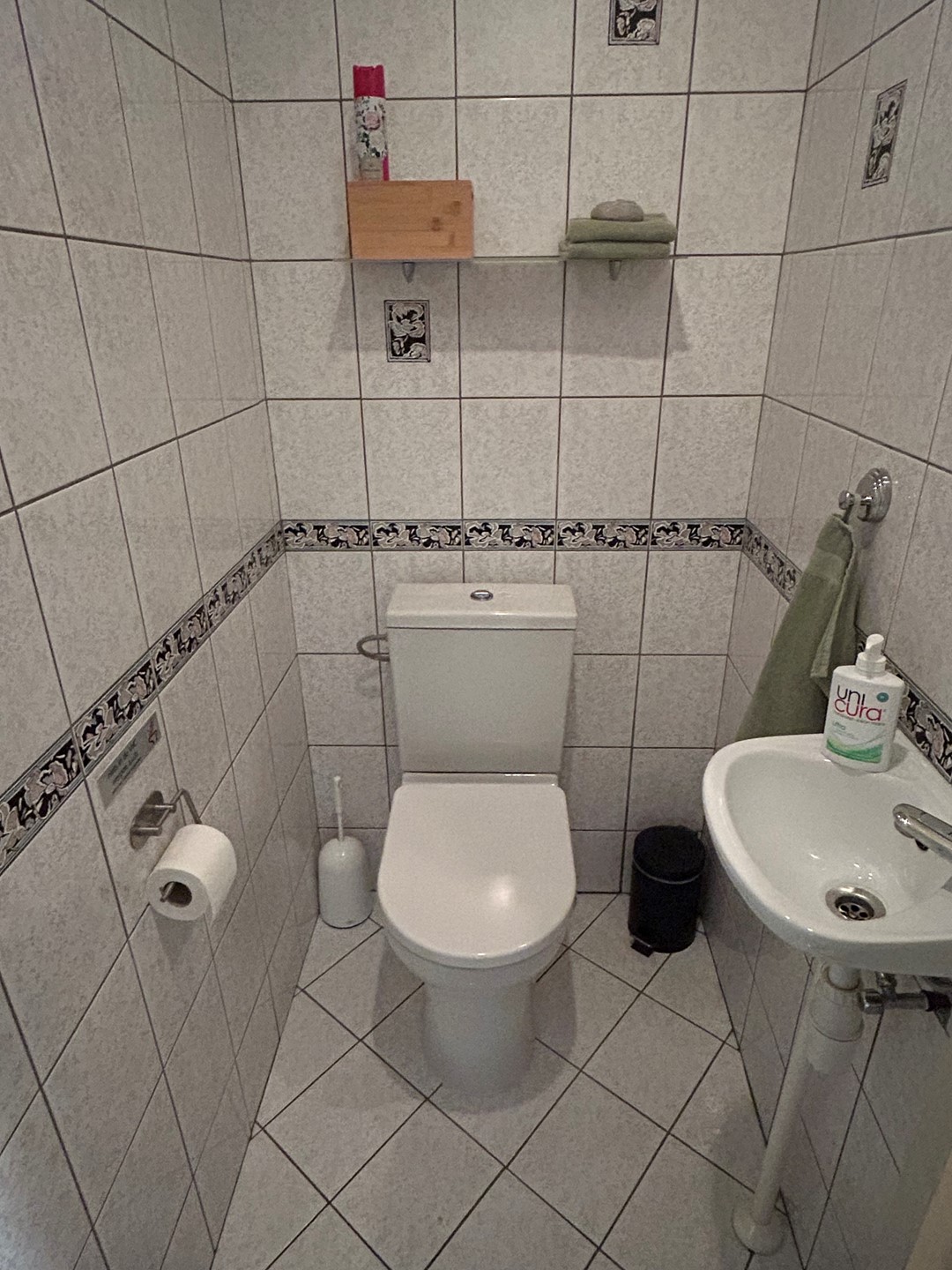 Gastentoilet 1,25 x 1,00 met plavuizenvloer, spots, duoblok en fonteintje.