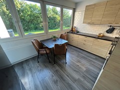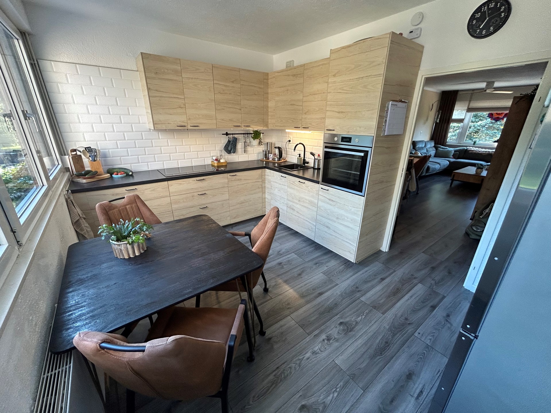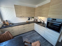 Keuken 4,30 x 3,05 met laminaatvloer en mooie aanbouwkeuken met keurig betegelde achterwand, keramische kookplaat met afzuigunit, vaatwasser, heteluchtoven en spoelbak.