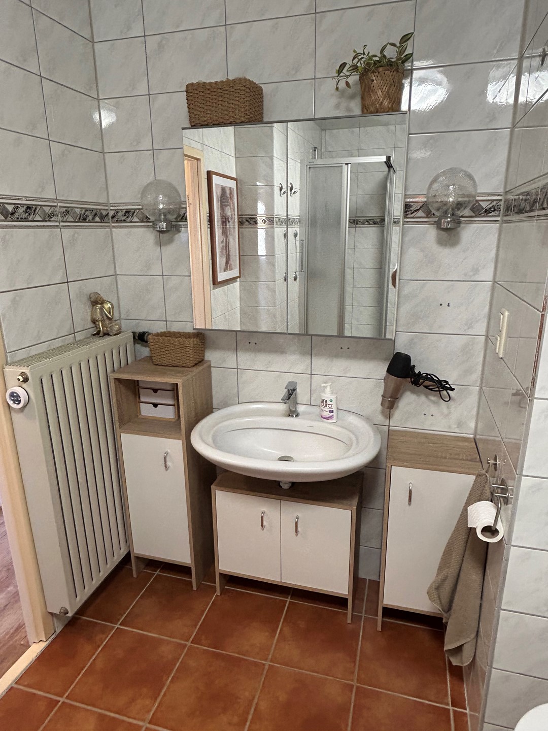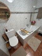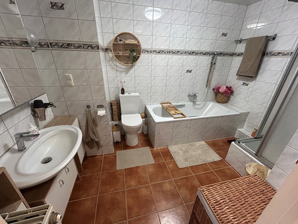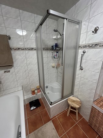 Badkamer 3,45 x 2,30/2,00 met plavuizenvloer, ligbad, douche met cabine, duoblok en badkamermeubel met wastafel.