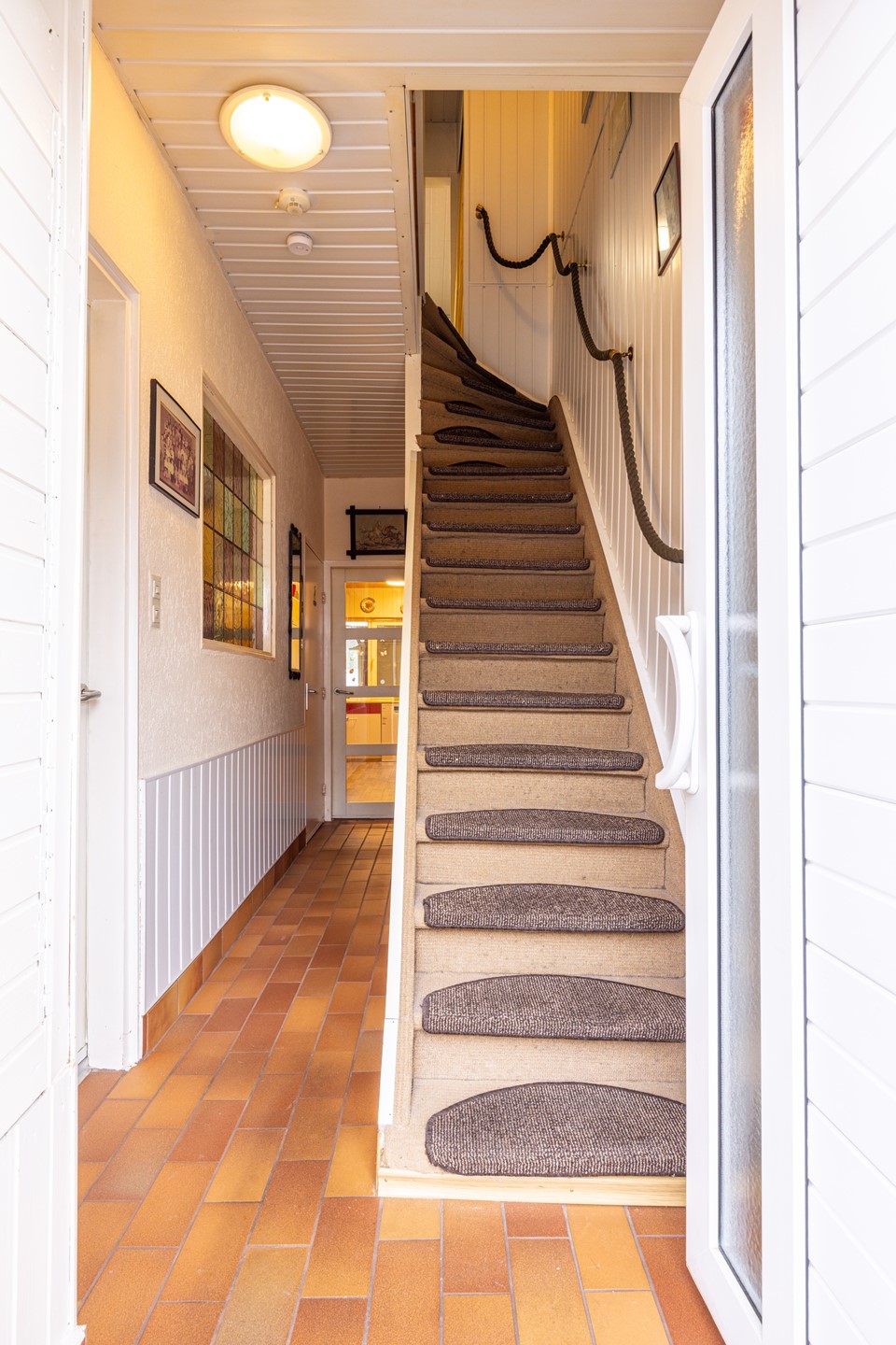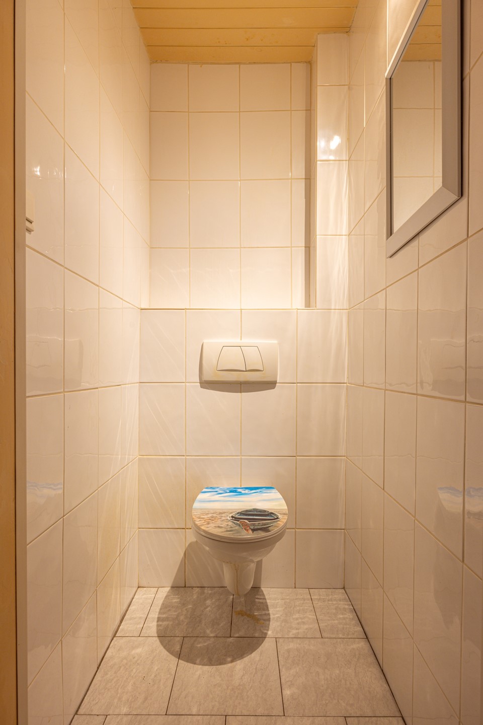 Via de voordeur kom je binnen in de ontvangsthal. Aan de linkerzijde van de woning bevindt zich bovendien een extra zijdeur met een hal die volledig doorloopt tot aan de achtertuin. Dit maakt de woning bijzonder praktisch: fietsen, tuinspullen of boodschappen kunnen eenvoudig achterom naar binnen, zonder dat je door de woonruimtes hoeft. De ontvangsthal is afgewerkt met een tegelvloer en biedt ruimte aan de garderobe en de meterkast. Daarnaast bevinden zich hier een wastafel, een zwevend toilet en de toegang tot de provisiekelder, ideaal voor extra opslag.