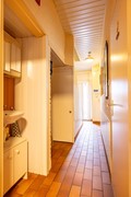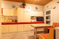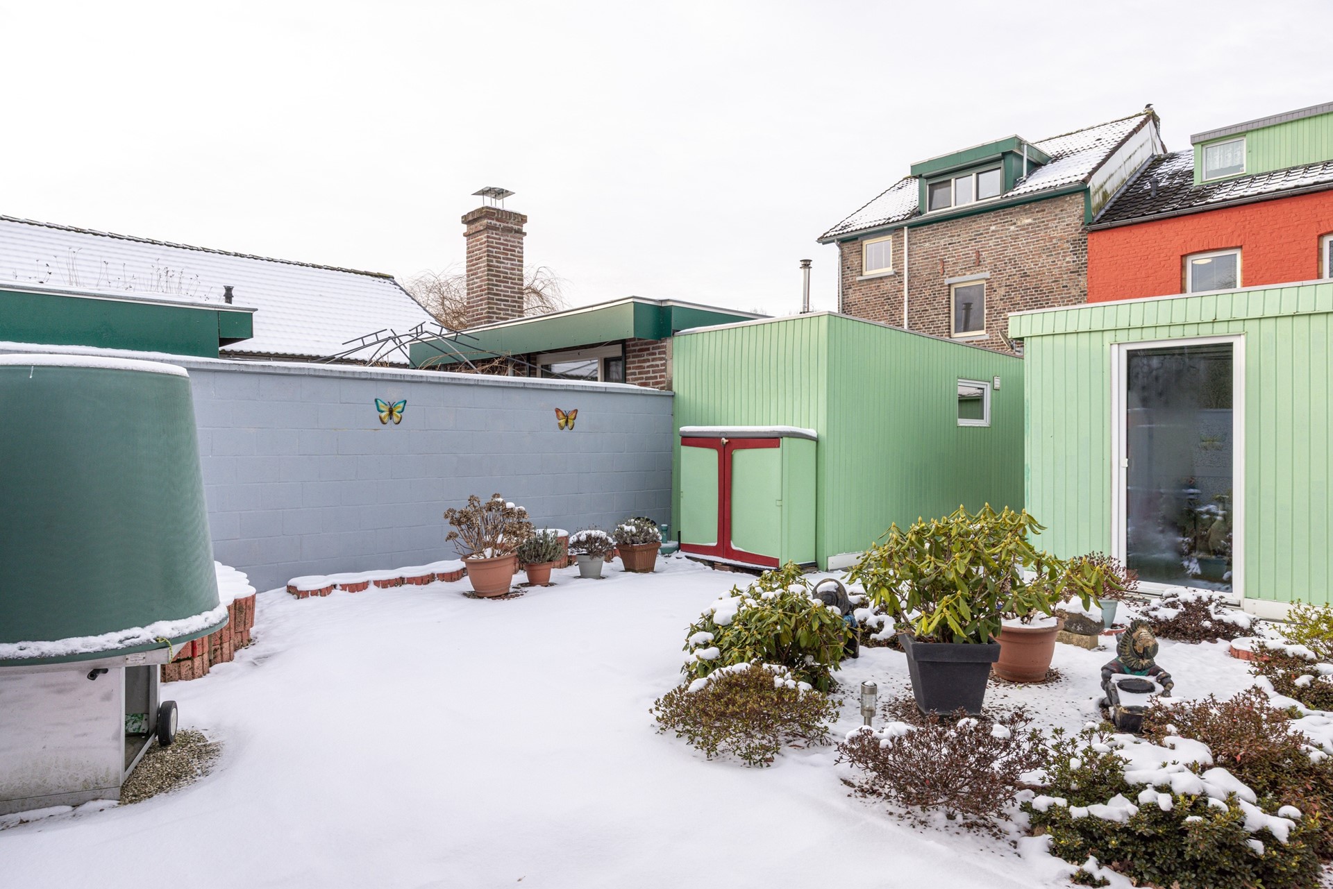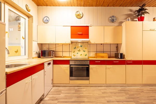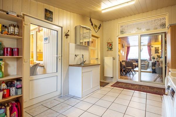 De bijkeuken is praktisch ingericht met een tegelvloer, een keukenblok en aansluitingen voor witgoed. Vanuit hier is er directe toegang tot de tuinkamer.
