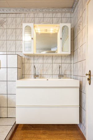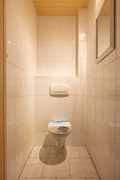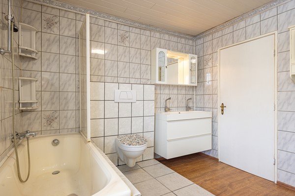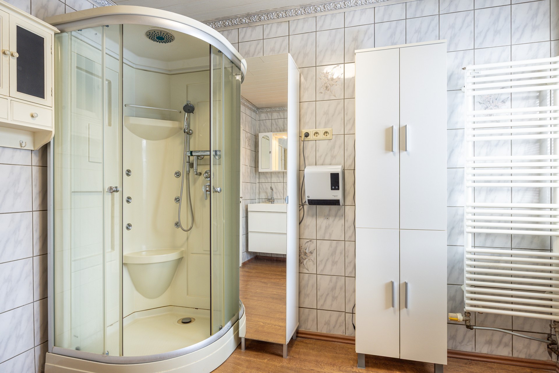 De badkamer is gedeeltelijk afgewerkt met laminaat en tegelwerk en compleet uitgevoerd. De ruimte beschikt over een ligbad, een douchecabine met meerdere showers (6 stuks) en een zwevend toilet.