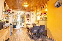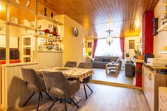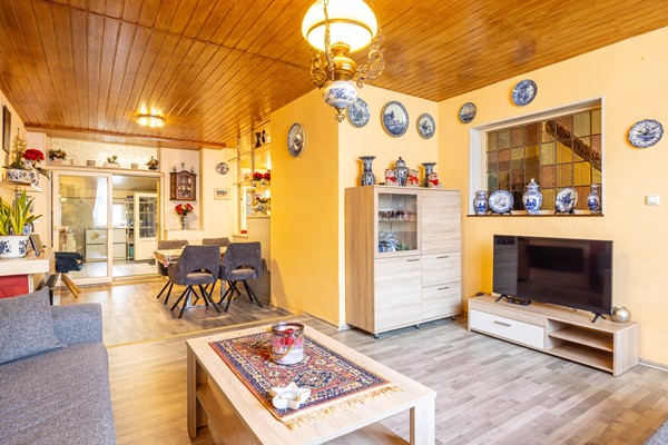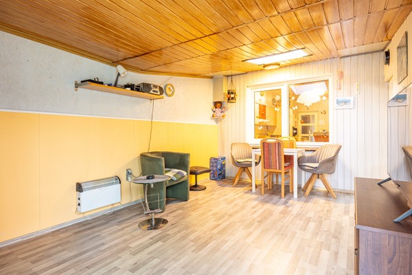 De woonkamer is een prettige leefruimte met voldoende daglicht en voorzien van een laminaatvloer. De ruimte staat in open verbinding met de keuken en biedt volop mogelijkheden om de indeling en sfeer geheel naar eigen smaak aan te passen. Via een glazen schuifpui is er toegang tot de bijkeuken, wat zorgt voor een fijne en praktische verbinding tussen de verschillende leefruimtes.