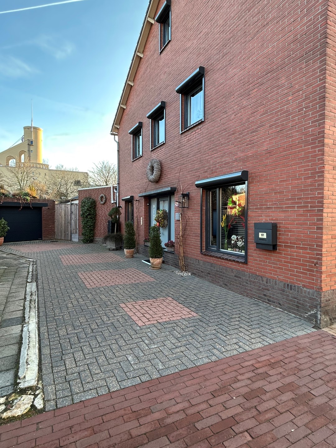 Lange betegelde oprit 15,65 x 4,15/3,85 met plaats voor meerdere auto's, mooie huisdeur, brede deur naar achtertuin, verlichting, brievenbus, en waterton.