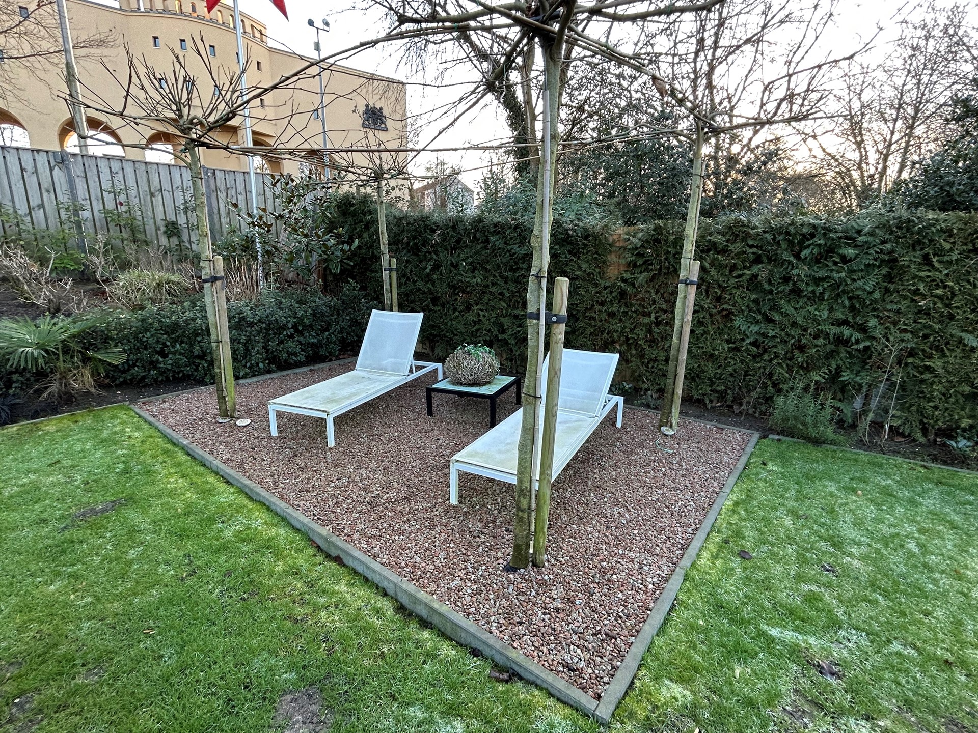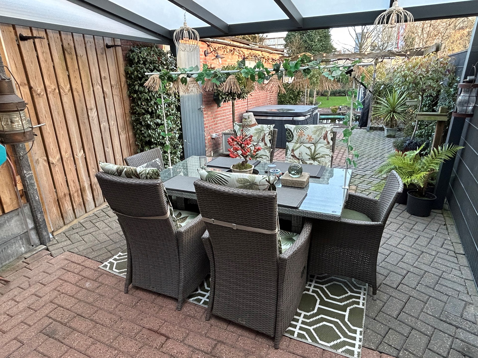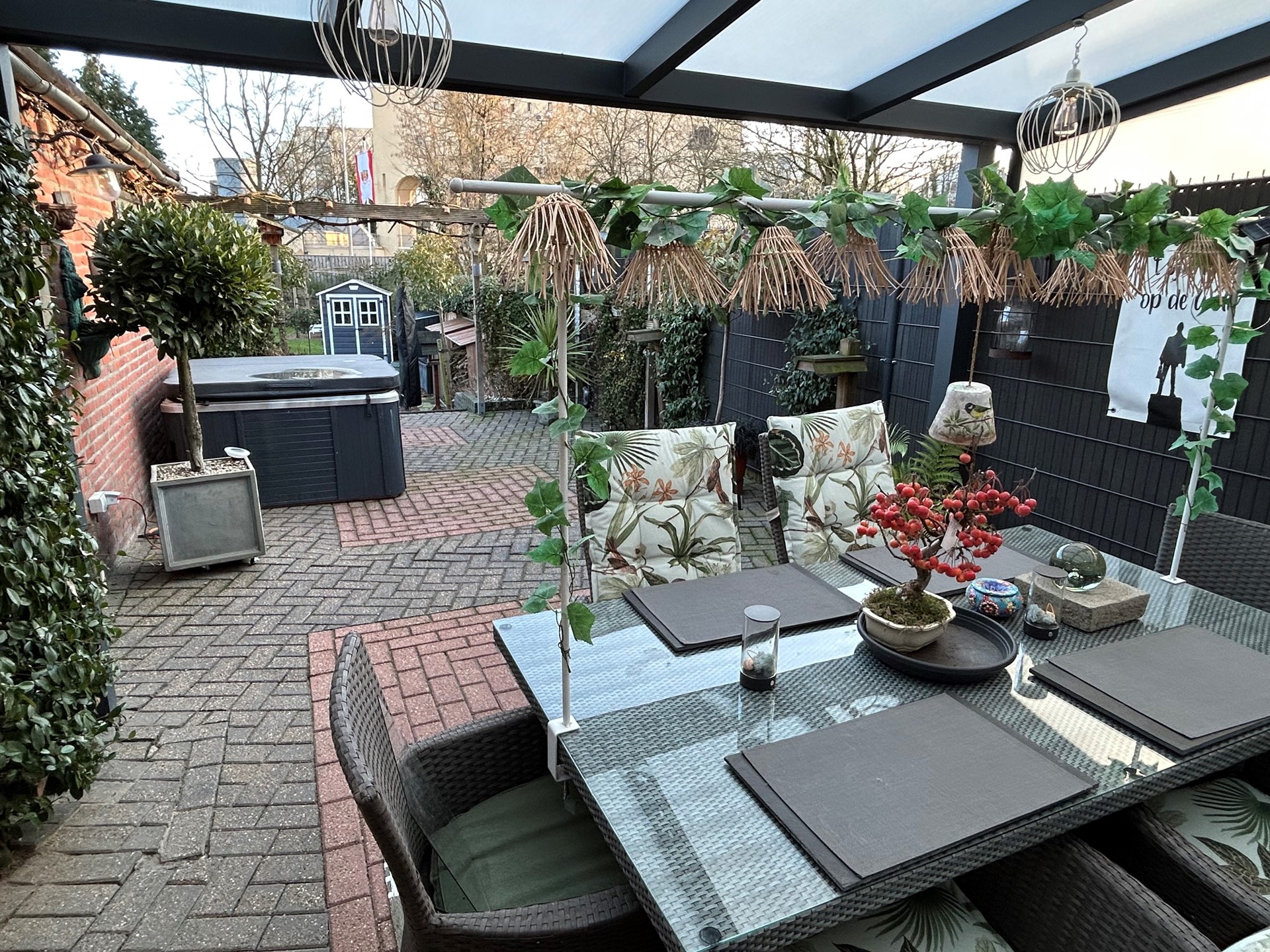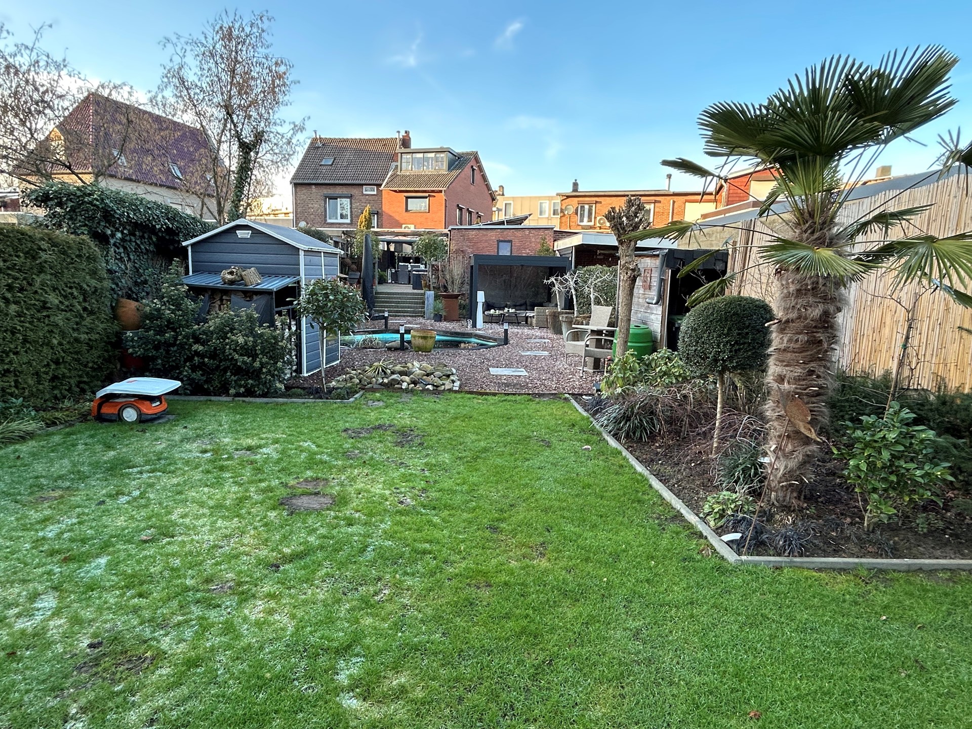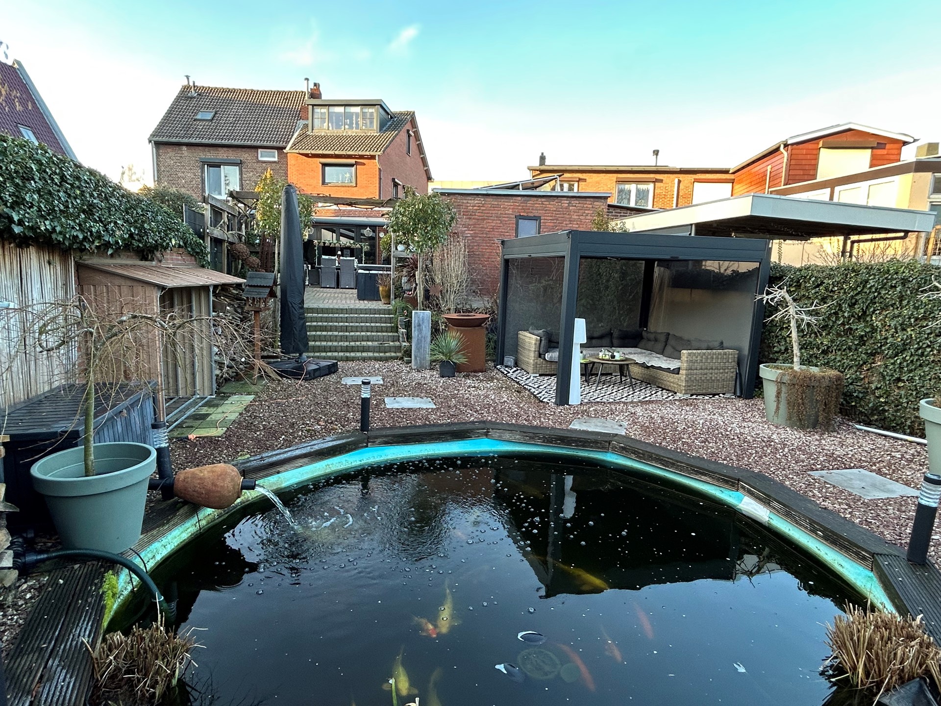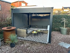 Achtertuin met terras met overkapping 4,10 x 3,80 met verlichting, gazon, vijver, bestrating, beplanting, houten schuttingen, kraan, elektriciteit en geweldig uitzicht op de schacht van Nulland.