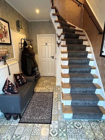 Mooie sfeervolle entree/hal 4,00 x 2,40 met laminaatvloer, inbouwspots, nieuwe meterkast met slimme stroommeter, deur naar woonkamer, keuken en gastentoilet en trap naar verdieping.