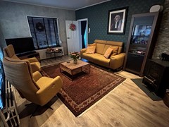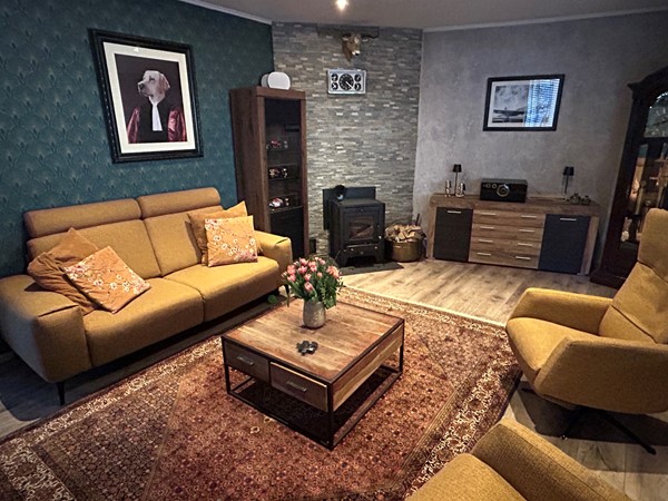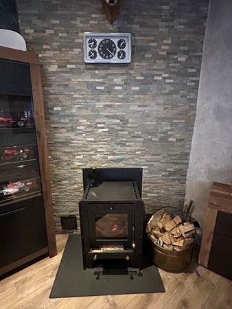 Woonkamer 6,15 x 4,00 met laminaatvloer, inbouwspots en houtkachel (ter overname).