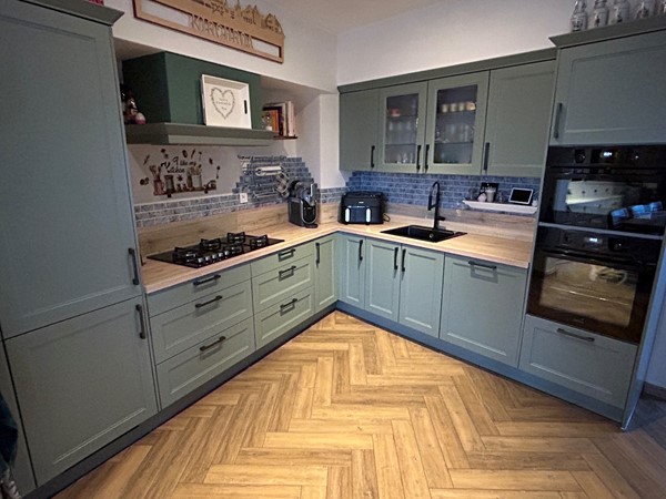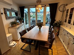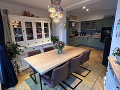 Leefkeuken 8,00 x 3,35/2,75 met pvc-laminaatvloer, inbouwspots, openslaande deuren en enkele deur naar achtertuin, airco, pelletkachel (ter overname) en aanbouwkeuken met 5-pits gasfornuis met afzuigunit, heteluchtoven, vaatwasser, combi-magnetron, koel/vriescombinatie en spoelbak.