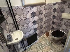 Gastentoilet 1,80 x 1,05 met laminaatvloer, inbouwspots, hangtoilet, wastafel en afzuiging.