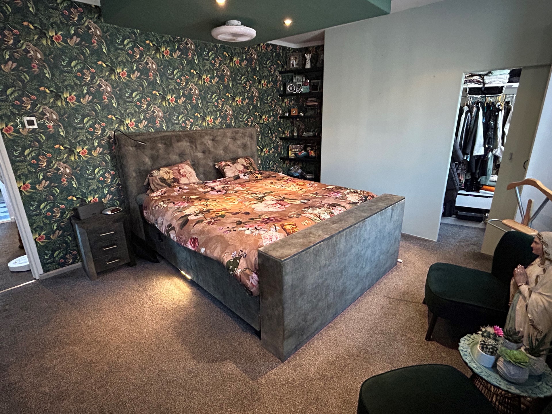 Slaapkamer 1: 4,75 x 4,00 met vloerbedekking, inbouwspots en walk-in-closet 3,10 x 1,30.