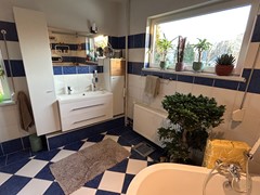 Badkamer 4,05 x 3,15 met plavuizenvloer met elektrische vloerverwarming, inbouwspots, ligbad, inloopdouche, hangtoilet en badkamermeubel met wastafel met 2 kranen.