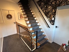 Overloop 3,90 x 2,35 met vloerbedekking, inbouwspots en vaste trap naar tweede verdieping.