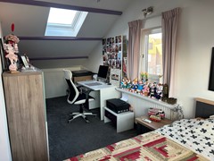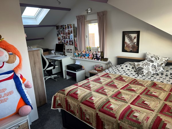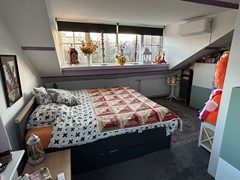 Slaapkamer 2: 6,00 x 4,95/2,30 met vloerbedekking, brede dakkapel, dakraam, airco en wastafel.
