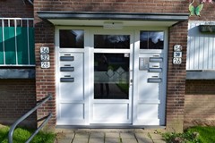 Gemeenschappelijke entree met bellen- en brievenbussenpaneel, intercom, trappenhuis en overal kunststof kozijnen.