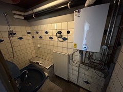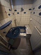 Badkamer 2,40 x 1,10 met plavuizenvloer, douche, wastafel, aansluitingen was-apparatuur en cv-combiketel Remeha Avanta van (gehuurd).