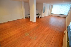 L-vormige woonkamer 9,30 x 5,75/3,55 met parketvloer, plafond met inbouwspots, schouw met open haard en deur naar keuken.