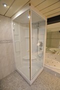 Badkamer 5,45 x 2,70 met granieten vloer met vloerverwarming, inbouwspots, jacuzzi met whirlpool en powerjets, stoom/massage douchecabine, hangtoilet, urinoir, design badkamermeubel met twee wastafels en twee design radiators.