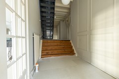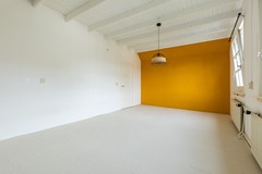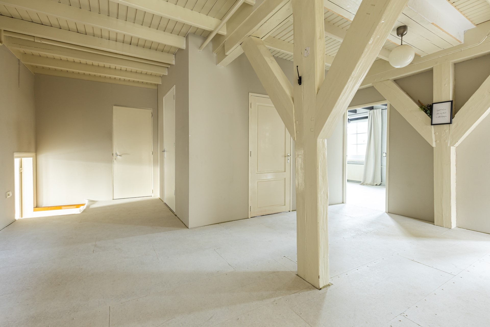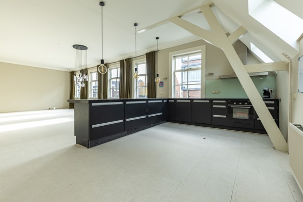 Aan de voorzijde ligt de indrukwekkende voormalige raadzaal, nu een royale woonkamer met hoge plafonds, veel licht en grote ramen. De volledige vloer is recent verwijderd en uitgevoerd met een vernieuwde, geïsoleerde en brandvertragende constructie. De woonlaag is hiermee direct klaar voor een nieuwe houten vloer of andere passende afwerking naar wens.