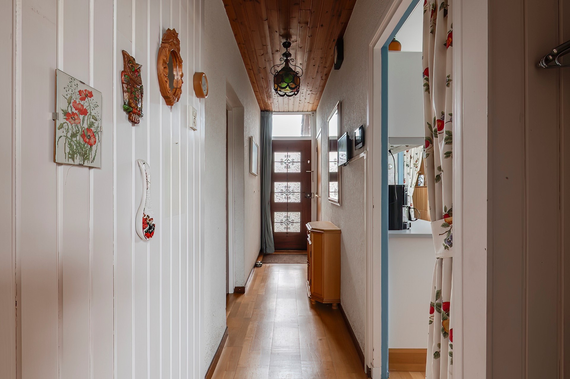 Je vindt in deze hal de toiletruimte, een garderobenis en de toegang tot de aangrenzende living, kantoorkamer en keuken.