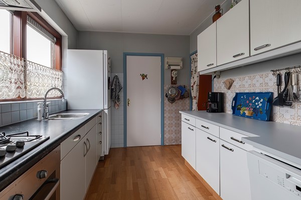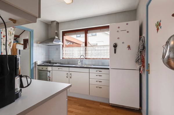 De keuken is gelegen aan de zijgevel en is uitgevoerd met twee tegenover elkaar geplaatste keukenopstellingen, eenvoudig en functioneel. De uitrusting bestaat uit een 1,5 spoelbak, gaskookplaat, elektrische oven, afzuigschouw en een vaatwasmachine. Praktisch is de aanwezigheid van een vaste kast.