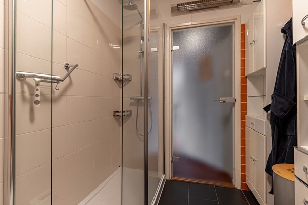 De badkamer is compleet en comfortabel ingericht. Je doucht er heerlijk in de ruime douche met glazen wanden, regendouche en handdouche. Het moderne wastafelmeubel met spiegel en verlichting biedt volop gebruiksgemak, terwijl het toilet het sanitair compleet maakt. Ook aan opbergruimte is gedacht, en de designradiator zorgt tenslotte voor de verwarming.