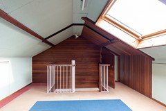 Aan de centrale overloop grenzen twee kamers, beide praktisch ingericht met vaste kasten en één met een bureau. Achter de knieschotten zijn praktische bergruimten aanwezig.