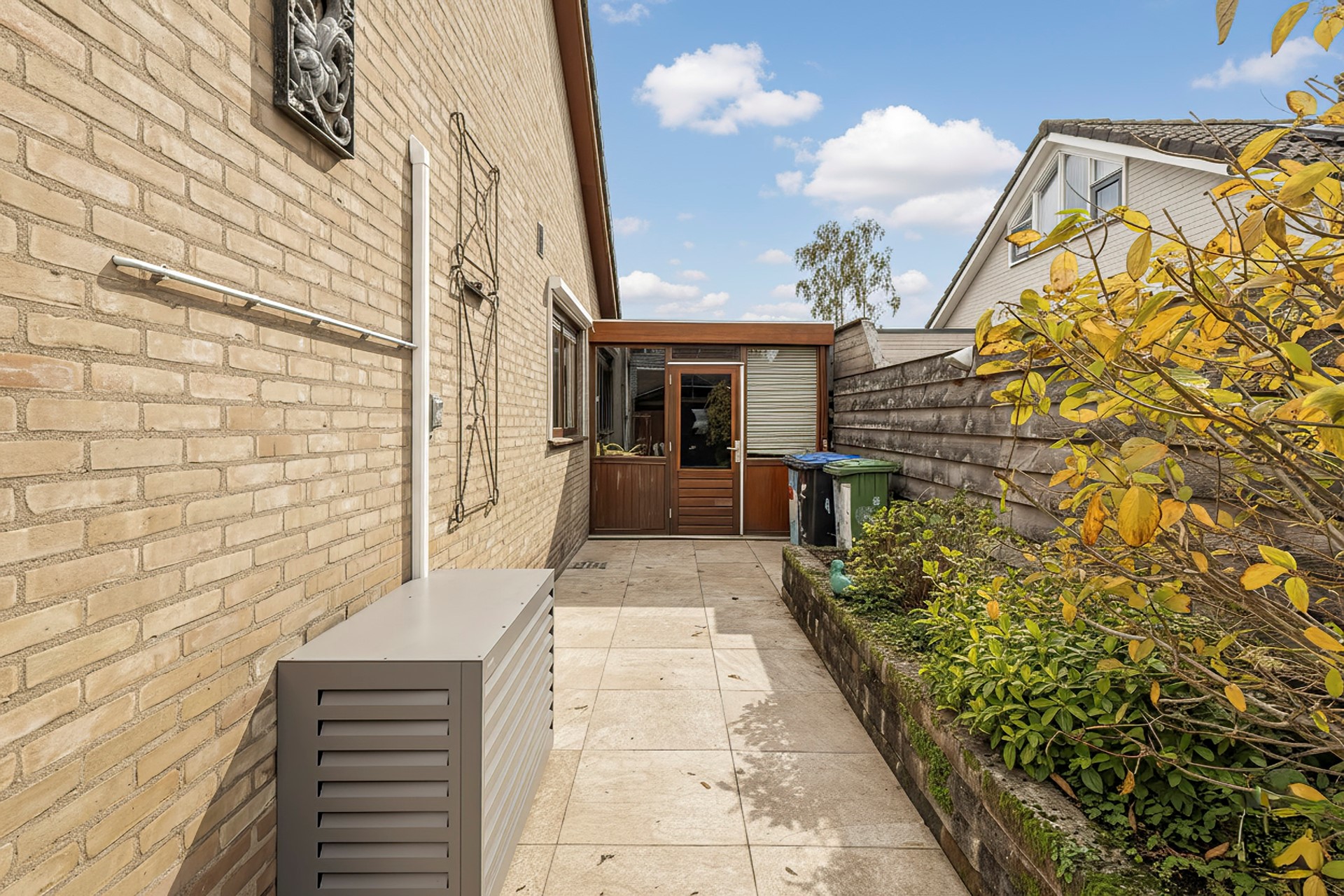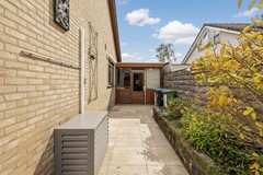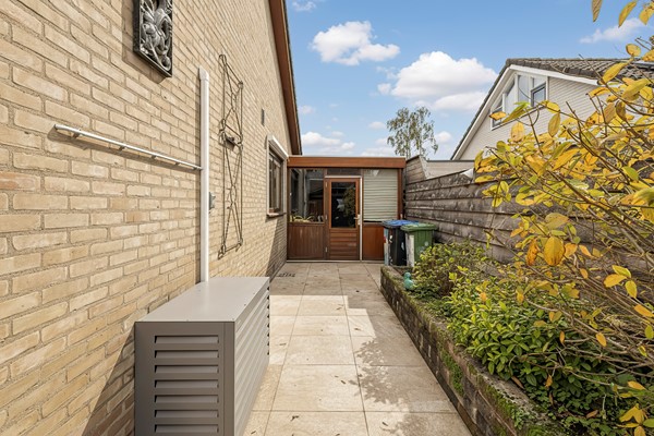 De achtertuin ligt op de zonnige zuidzijde. De tuinaanleg is stijlvol en onderhoudsvriendelijk, waarvoor je zonder al te veel inspanning optimaal van deze tuin kunt genieten. De verharding van tegels vormt een mooie basis, die speels omzoomd wordt door verhoogde metselwerk borders met een gevarieerde beplanting. De lichtpunten in deze borders zorgen ’s avonds voor een sfeervolle ambiance.
