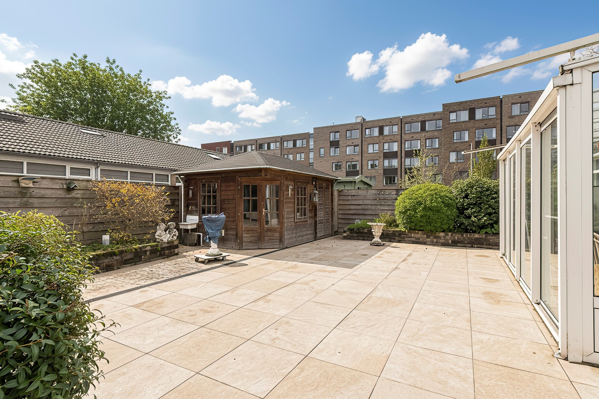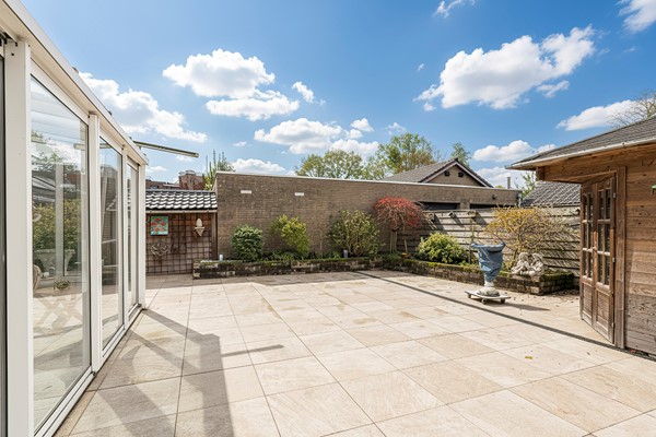 Achterin de tuin staat een ruim tuinhuis met elektra en verlichting. Tegen de buitengevel van dit tuinhuis vind je een uitstortgootsteen en een dubbel stopcontact. Daarnaast is er een kleine houten schuur, ideaal voor het opslaan van de pelletzakken.
