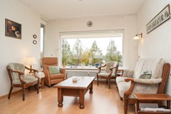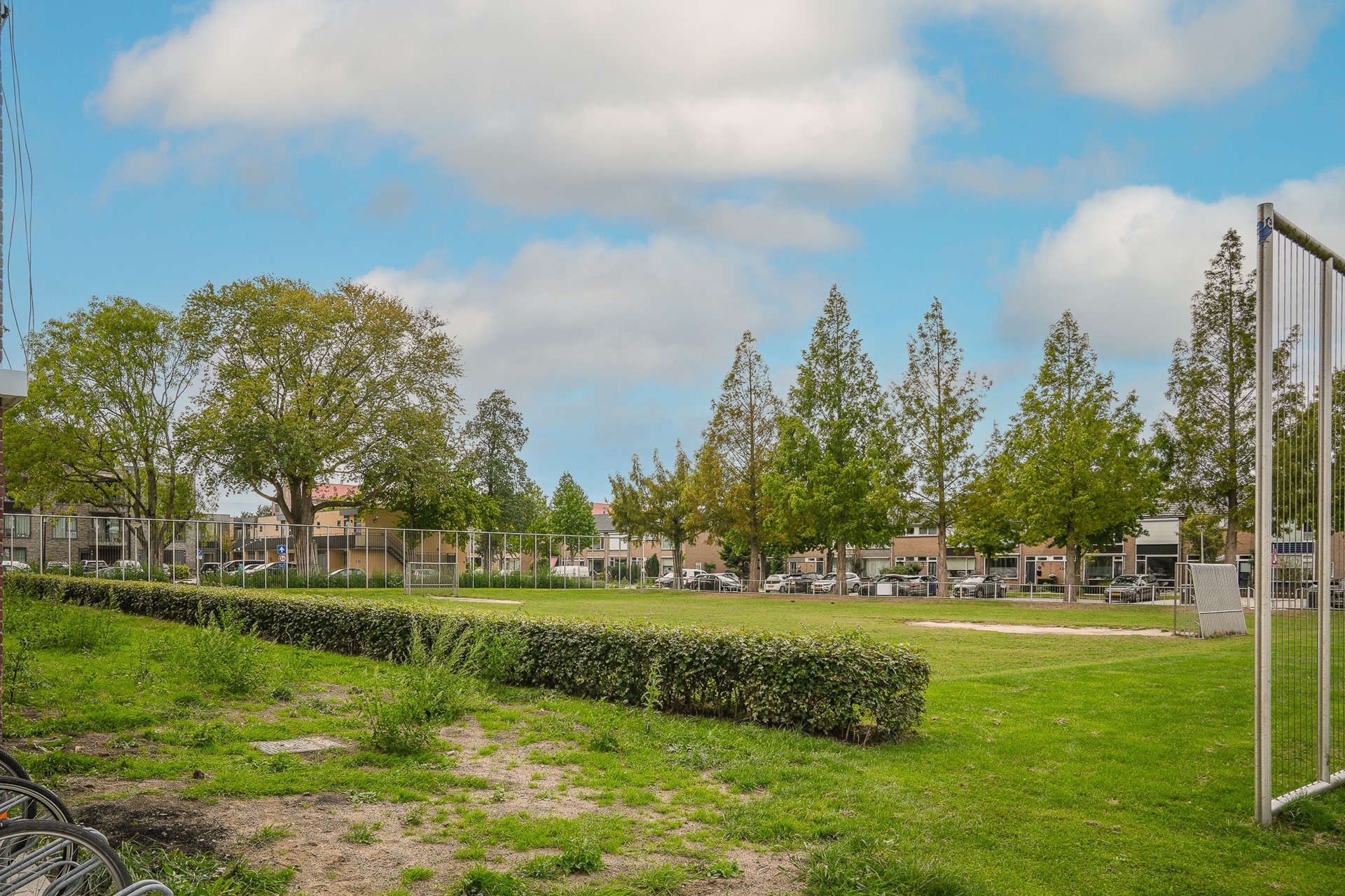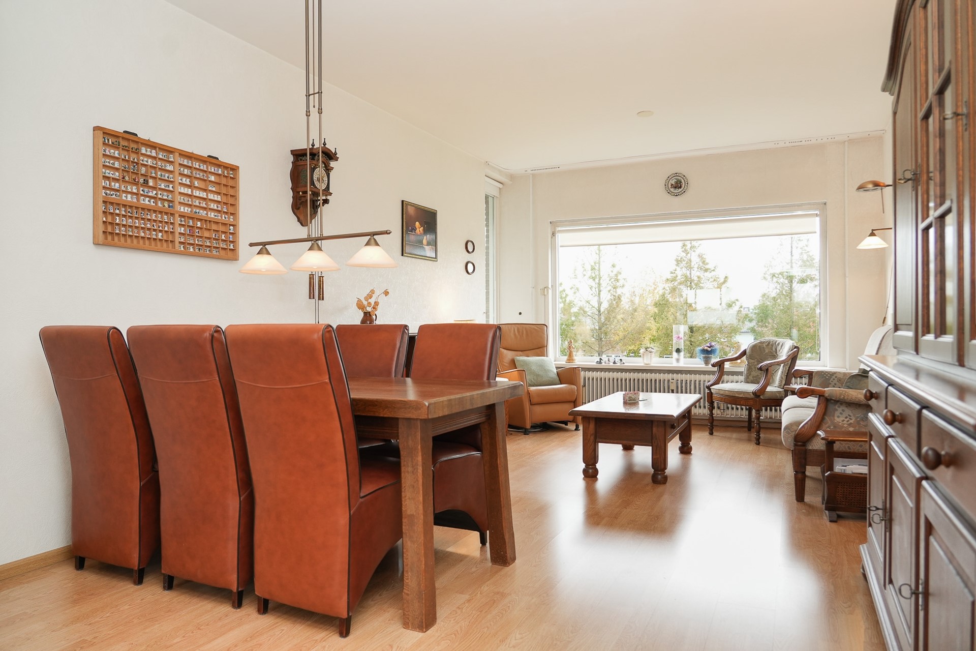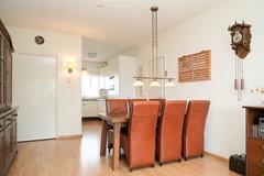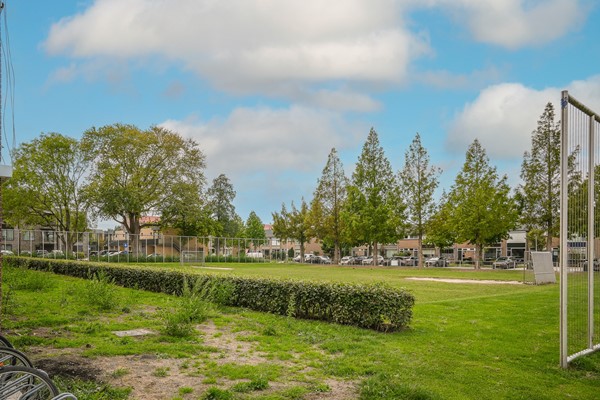 Je komt binnen in een compacte hal met toegang tot de woonkamer. Bij binnenkomst valt direct het royale formaat van de woonkamer op. Dankzij het grote raam komt hier veel daglicht binnen en heb je fraai uitzicht op het sportveld en de groene omgeving.