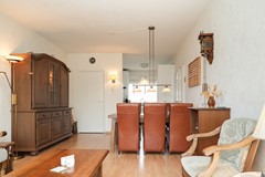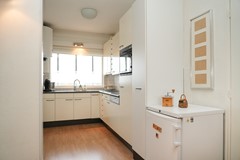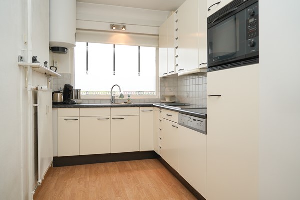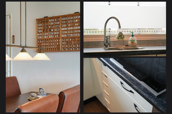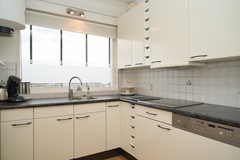 De open keuken ligt aan de voorzijde en vormt een praktische en gezellige verbinding met de woonruimte. Hoewel de keuken wat ouder is, is alles aanwezig en kun je hier prima uit de voeten. De keuken is uitgerust met een spoelbak met mengkraan, koelkast, combi magnetron, vaatwasser, keramische kookplaat, afzuigkap en apothekerskast.