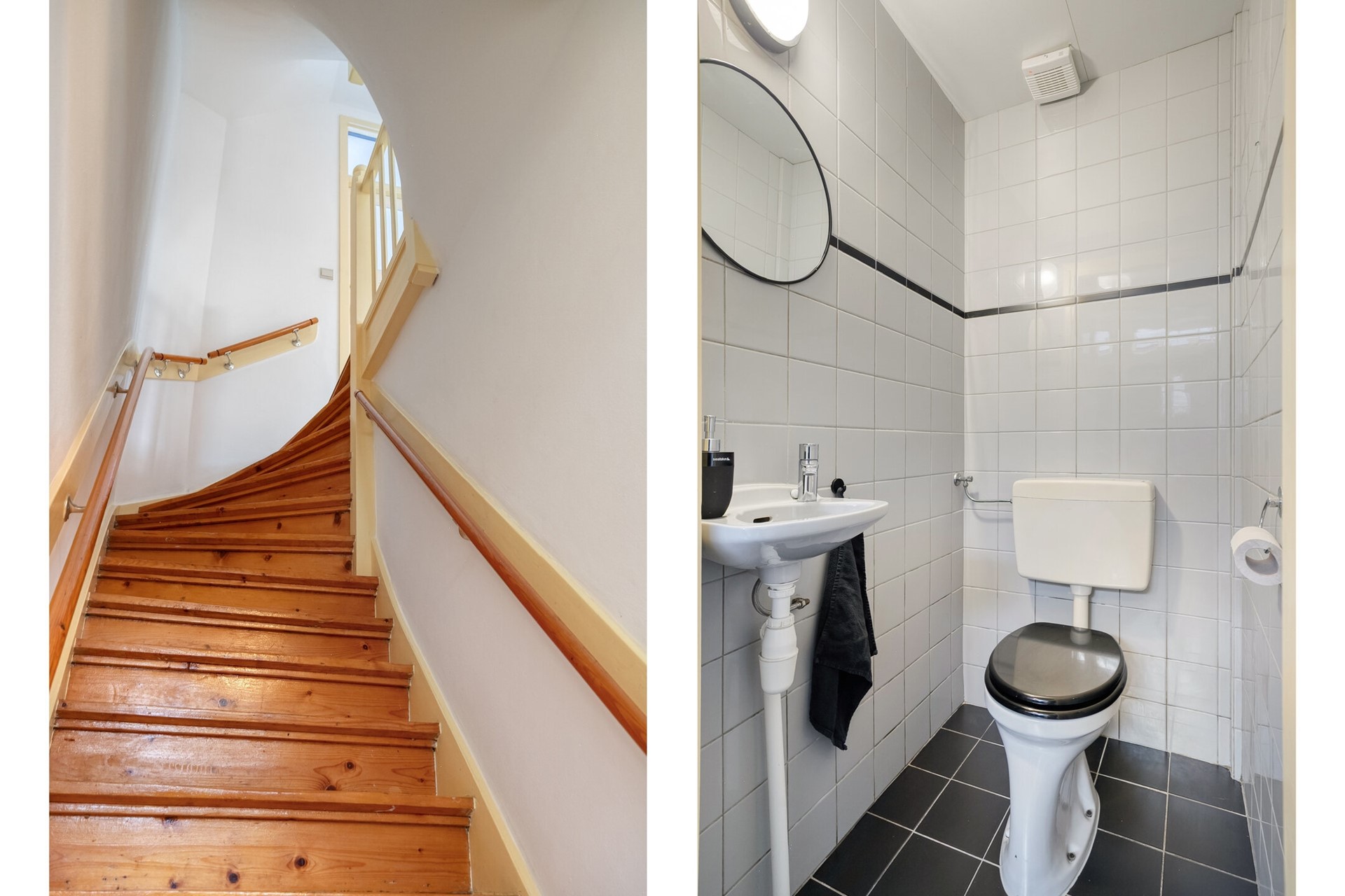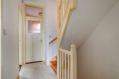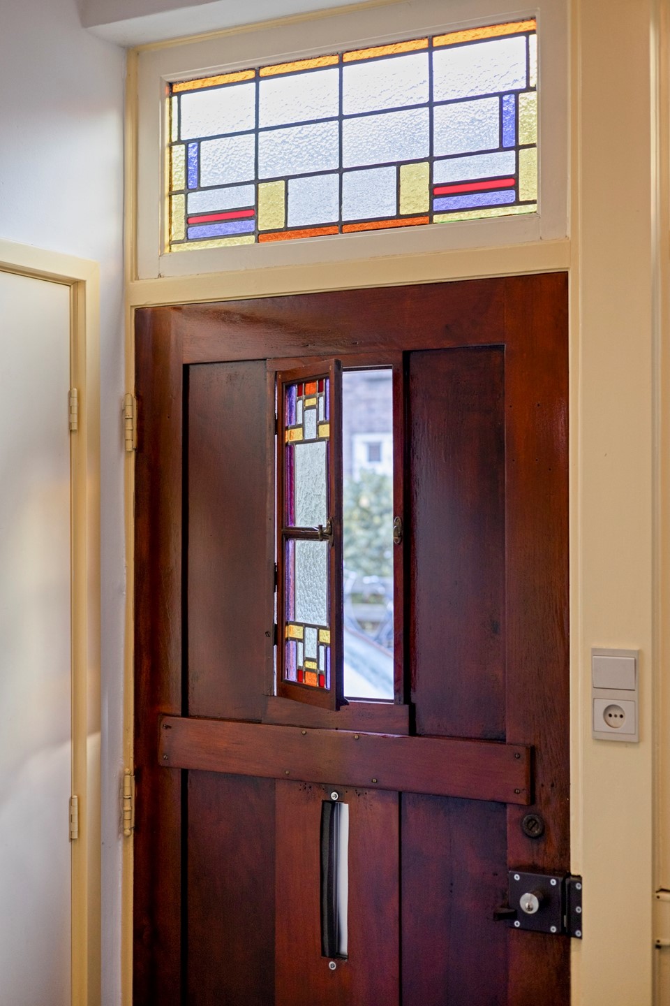 Zodra je de voordeur opent, word je meegenomen door sfeer. In de ruime hal vallen direct de originele paneeldeuren, het glas-in-lood en de royale maatvoering op. Hier bevindt zich de meterkast, een ruime garderobe en het eerste toilet met een fontein.