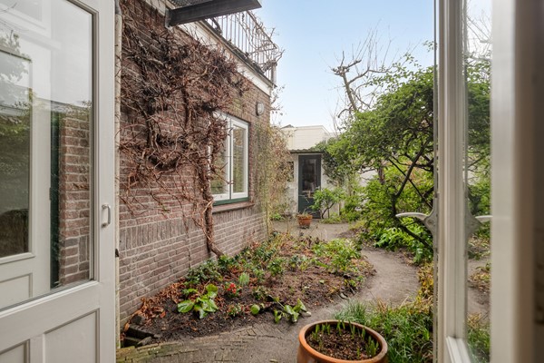 De achtertuin is een groot pluspunt: zonnig gelegen op het zuidwesten, circa 12 x 6 / 3,40 meter, met een schuur van 2,15 x 3,10 meter (voorzien van elektra) én dus de extra werkkamer. Via de achterom is de tuin bereikbaar en via een trap is er toegang tot het dakterras op de eerste verdieping. Maar die straks.