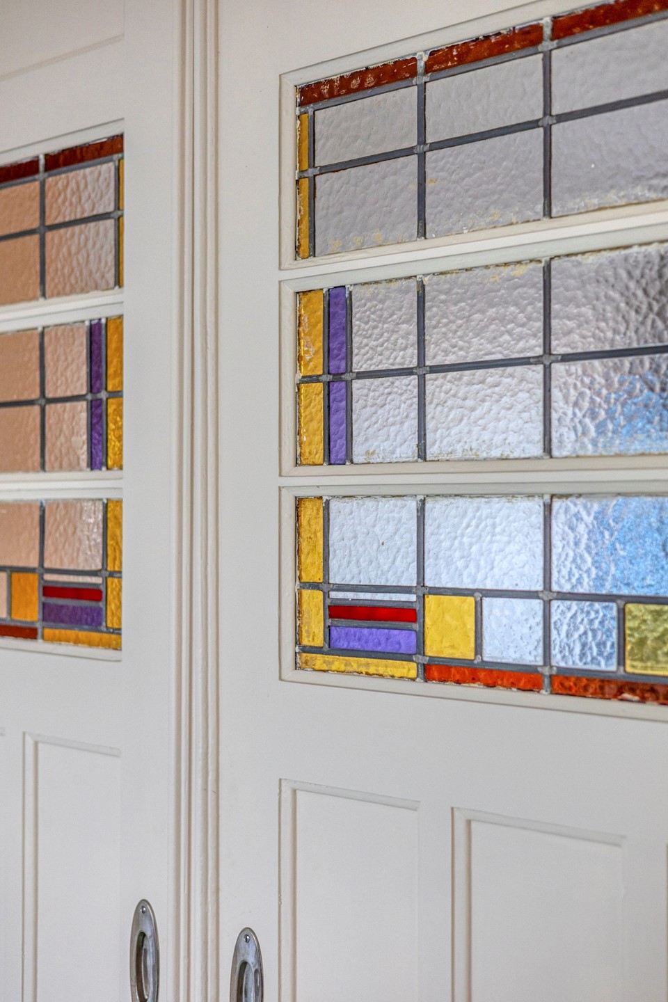 Op de eerste etage verraadt de overloop al dat dit niveau net zo bijzonder is. Het trappenhuis is op zichzelf al bijzonder: hoge wanden, mooie lijnen en originele elementen die je blik vanzelf omhoog trekken. Aan de voorzijde ligt een extra (slaap)kamer en daarnaast een fantastische voor- en achterkamer en suite, gescheiden door originele glas-in-lood schuifdeuren – iets wat je zelden nog ziet op deze verdieping. Beide kamers zijn ruim, hoog en voorzien van vaste kasten.