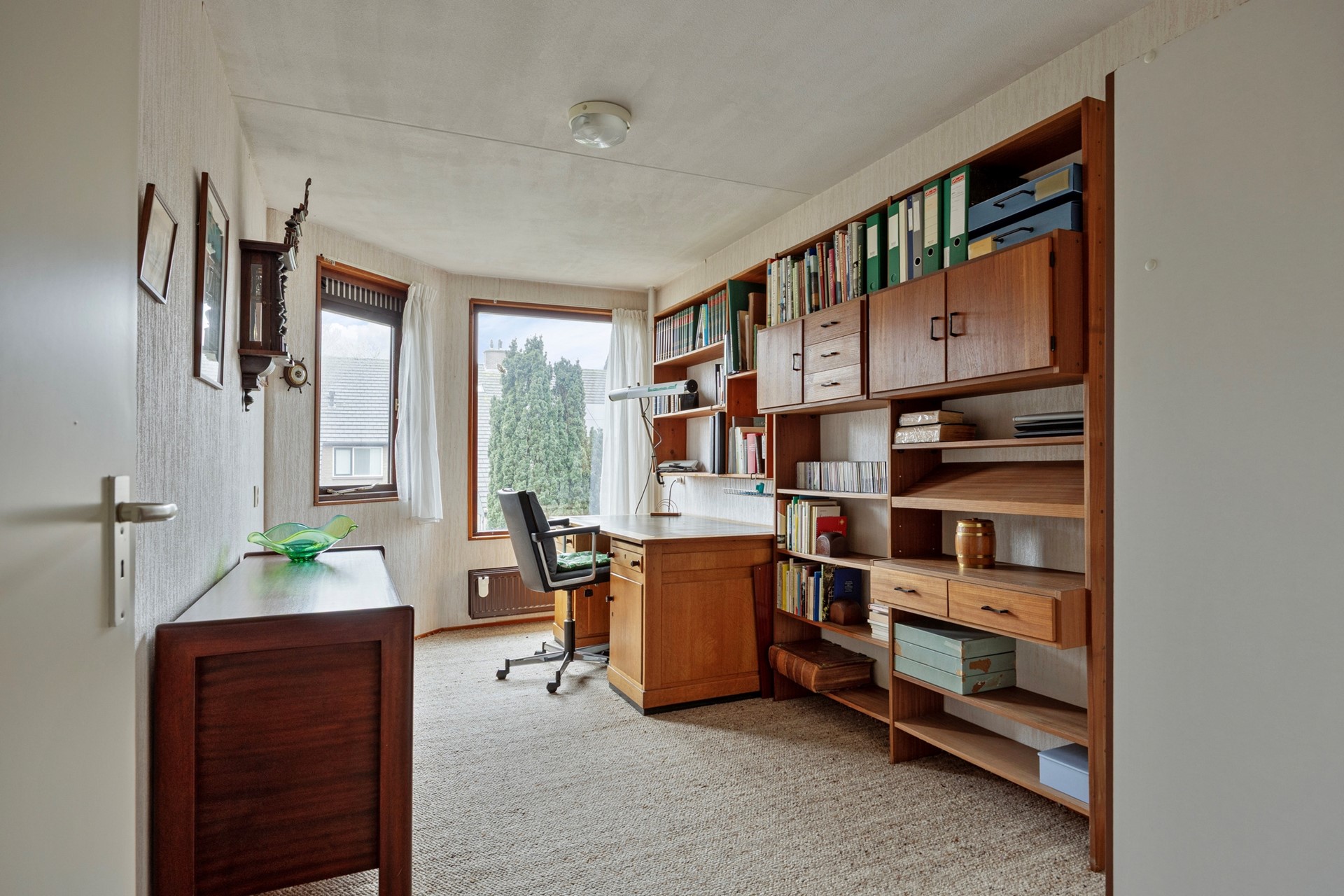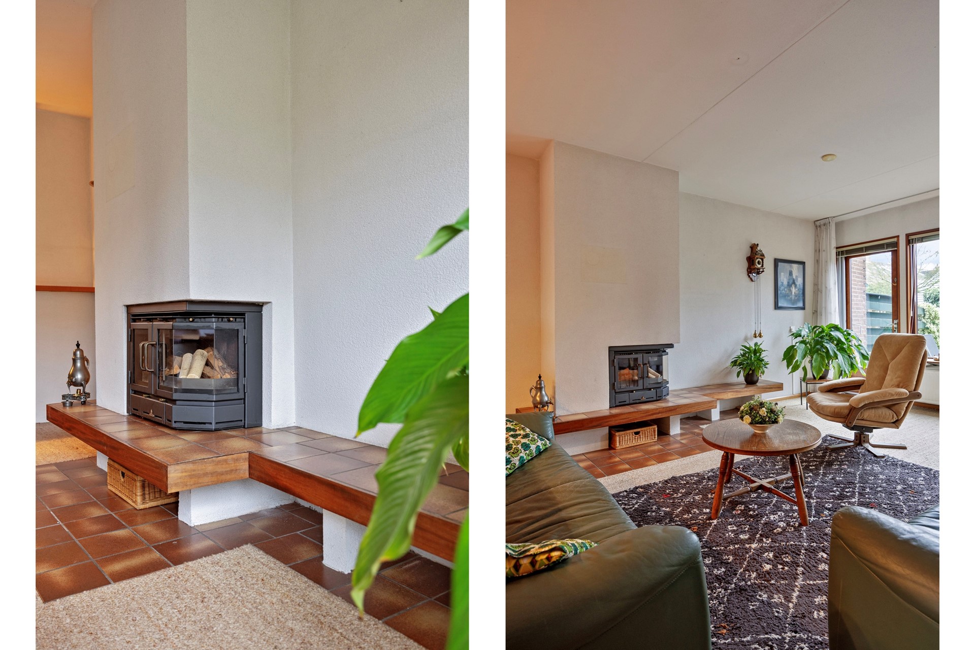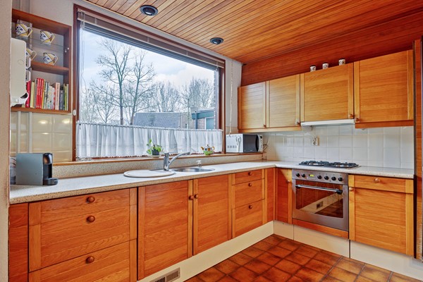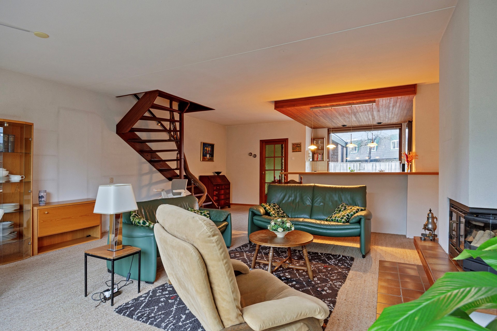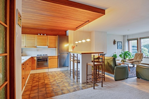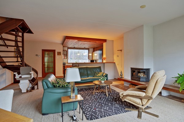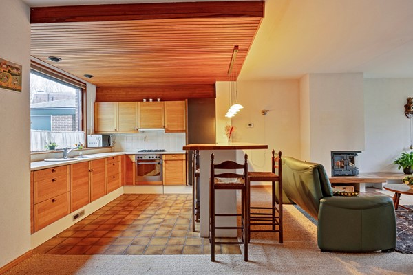 Dan loop je door naar de woonkamer… en hier valt eigenlijk maar één woord te gebruiken: ruimte. Met een breedte van maar liefst 5,75 meter is dit een woonkamer waar je moeiteloos meerdere zithoeken kunt creëren. De gesloten haard zorgt voor sfeer en warmte, en de open keuken met baropstelling maakt het geheel tot een fijne leefruimte. De keuken is gedateerd, maar juist dat biedt enorme kansen: hier kun je écht jouw droomkeuken realiseren, helemaal naar eigen smaak en stijl. Alles is goed onderhouden, dus je kunt hier rustig stap voor stap moderniseren.