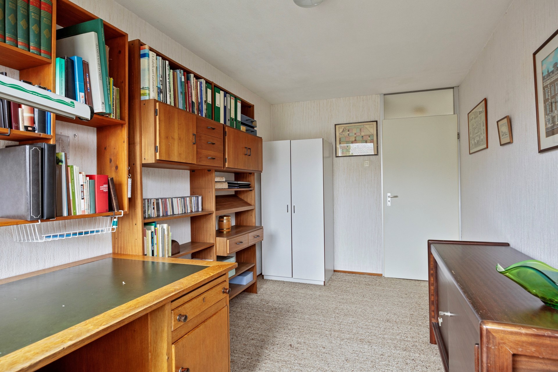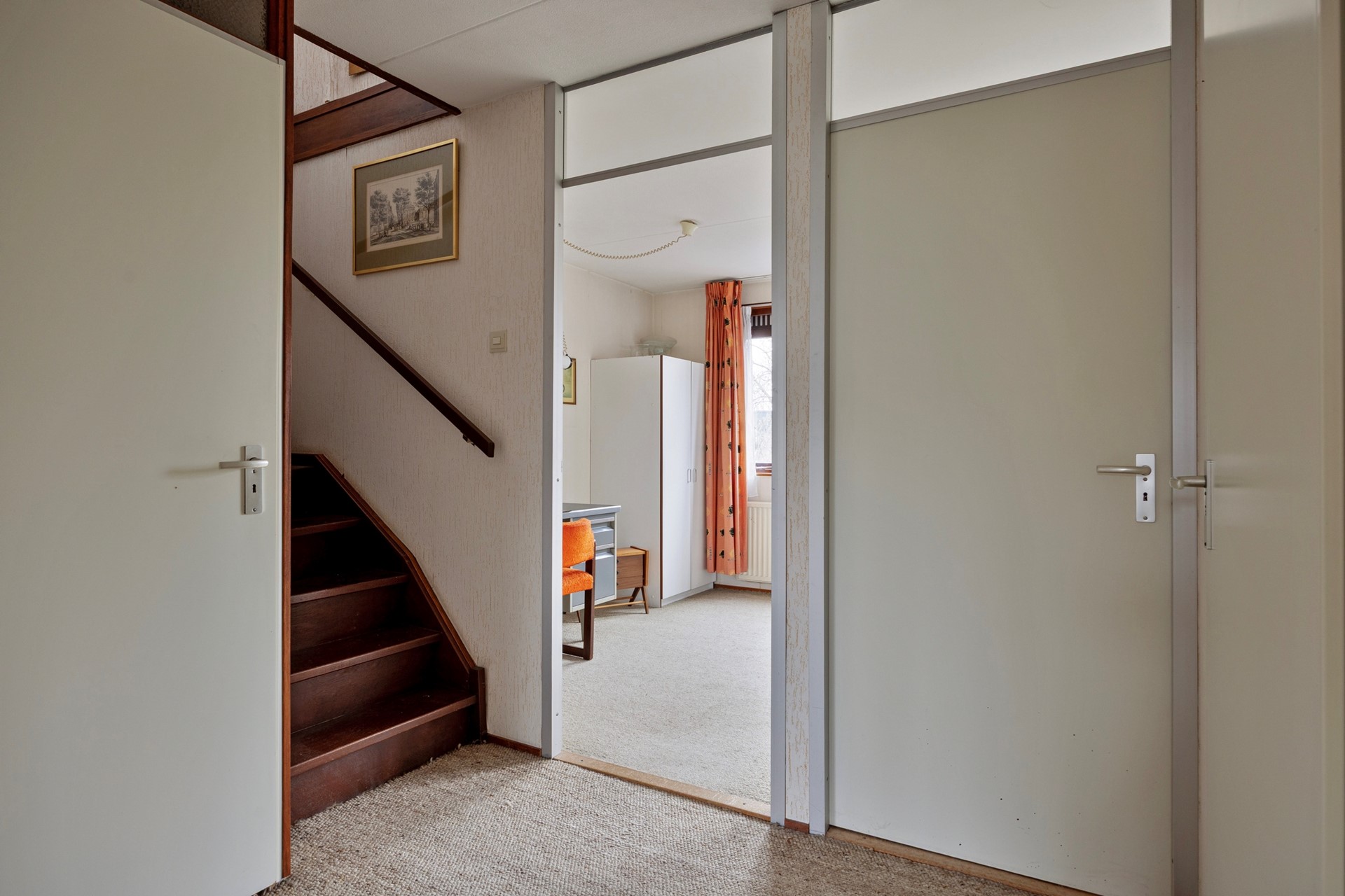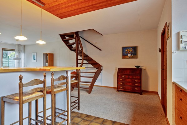 Binnen stap je binnen in een riante hal met garderoberuimte, de meterkast en toegang tot het toilet met fonteintje. Niet hypermodern, maar wel ruim en functioneel. Vanuit de hal is ook de inpandige berging bereikbaar — ideaal voor fietsen, opslag of hobbyspullen.