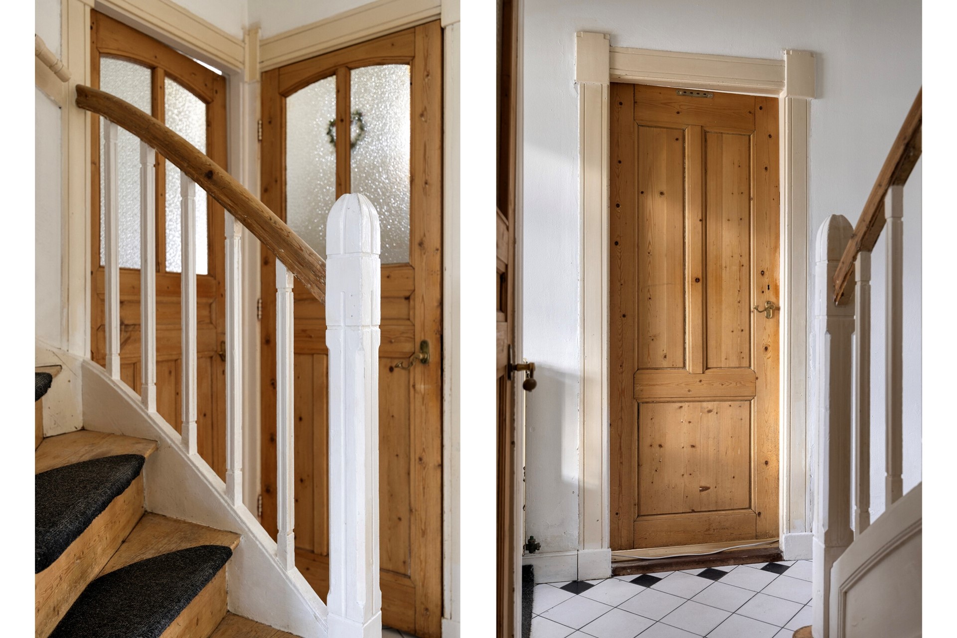 Via de fraaie vestibule betreed je de woning. De eerste indruk? Grootse hoogte, klassieke details en een gevoel van welkom. De oorspronkelijke paneeldeuren, sierlijke deurlijsten, hoge plafonds en karaktervolle trapleuningen verraden direct dat dit een bijzonder huis is. Vanuit de vestibule loop je door naar de centrale gang, waar je al een glimp opvangt van de Oude Rijn aan de achterzijde – een uitzicht dat nooit verveelt.