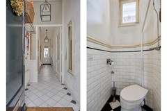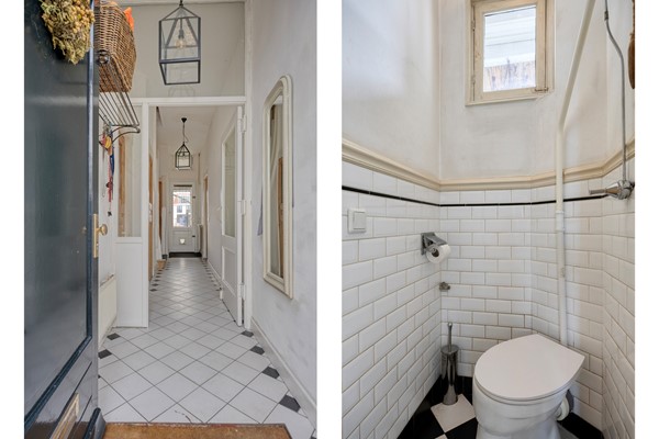 Aan de linkerzijde bevindt zich de "opkamer"/bijkeuken, een heerlijke ruimte met hoge ramen en een charmante doorkijk naar de keuken. In de gang vind je verder een trapkast, het eerste toilet en een tweede toegang tot de keuken.
