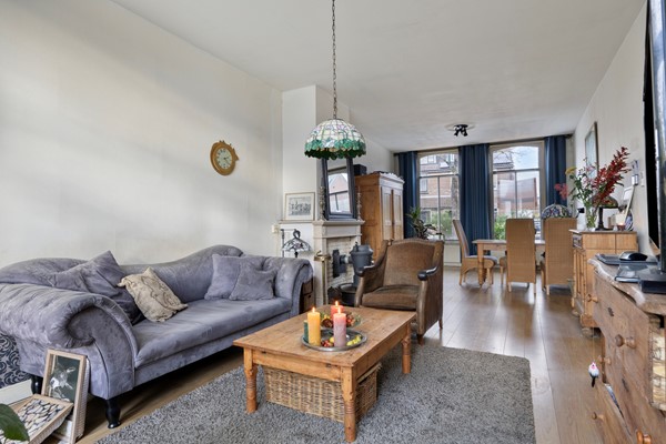 De woonkamer is een ware blikvanger. Oorspronkelijk een en-suite woonkamer, nu één grote ruimte van bijna 40 m² waar de sfeer van toen behouden is gebleven. Denk aan de hoge schuiframen aan de voorzijde, de haard, de prachtige lijstwerken en natuurlijk de openslaande deuren naar de tuin. Elke hoek ademt nostalgie en warmte – een plek waar je meteen tot rust komt.