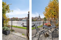 Aan de achterzijde liggen nog twee slaapkamers. De kleinste – die nog altijd riant is – beschikt over een vaste kast en heeft toegang tot het achterbalkon met prachtig uitzicht over de Oude Rijn. De grootste slaapkamer biedt eveneens toegang tot het balkon, extra bergruimte onder de knieschotten en een wastafel. Hier word je wakker met een uitzicht dat elke dag bijzonder blijft.