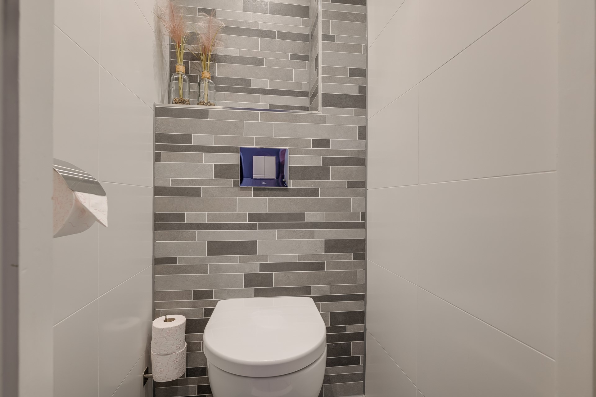 The bathroom features a bathtub, washbasin and a washing machine connection. The toilet is separate. The layout is practical and well thought out.