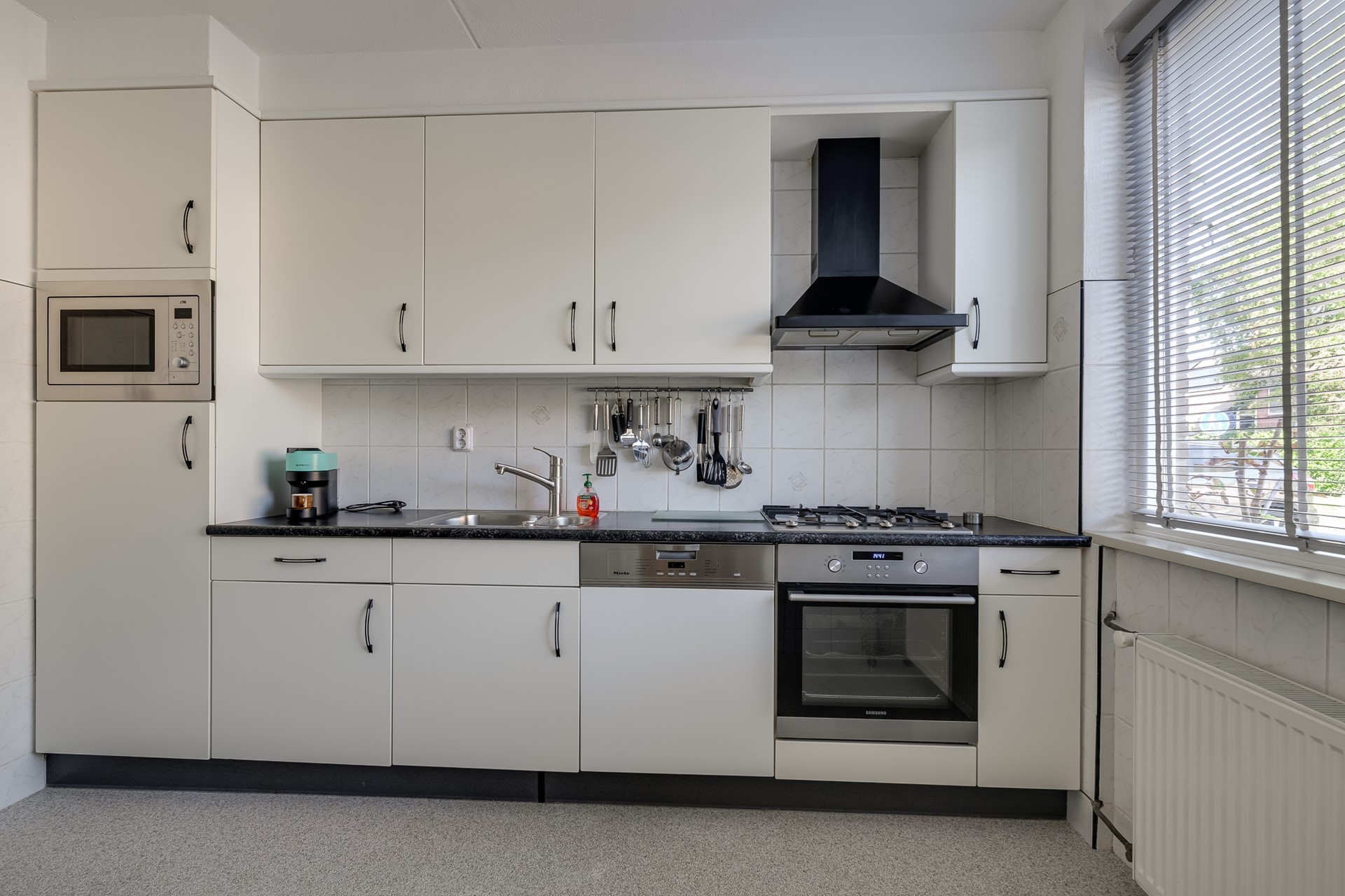 The living room extends across the full width of the house, with double doors opening onto the peaceful garden — a perfect spot to relax and enjoy the afternoon sun. The kitchen at the front is well-equipped with built-in appliances (oven, gas hob, extractor hood, dishwasher and microwave).