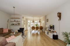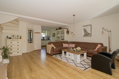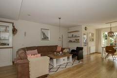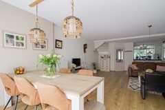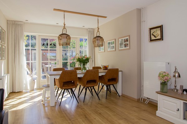 De woonkamer voelt licht en ruim, met een fijne breedte die direct opvalt. Dankzij de uitbouw is er alle ruimte voor een grote eettafel waar het gezin samenkomt en een gezellige zithoek met uitzicht op de tuin. De bijkeuken met garderobe en extra bergruimte zorgt voor dat beetje extra gemak dat het dagelijks wonen zo comfortabel maakt. De keuken sluit mooi aan op de leefruimte, wat het huis een open en gemoedelijke sfeer geeft.