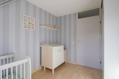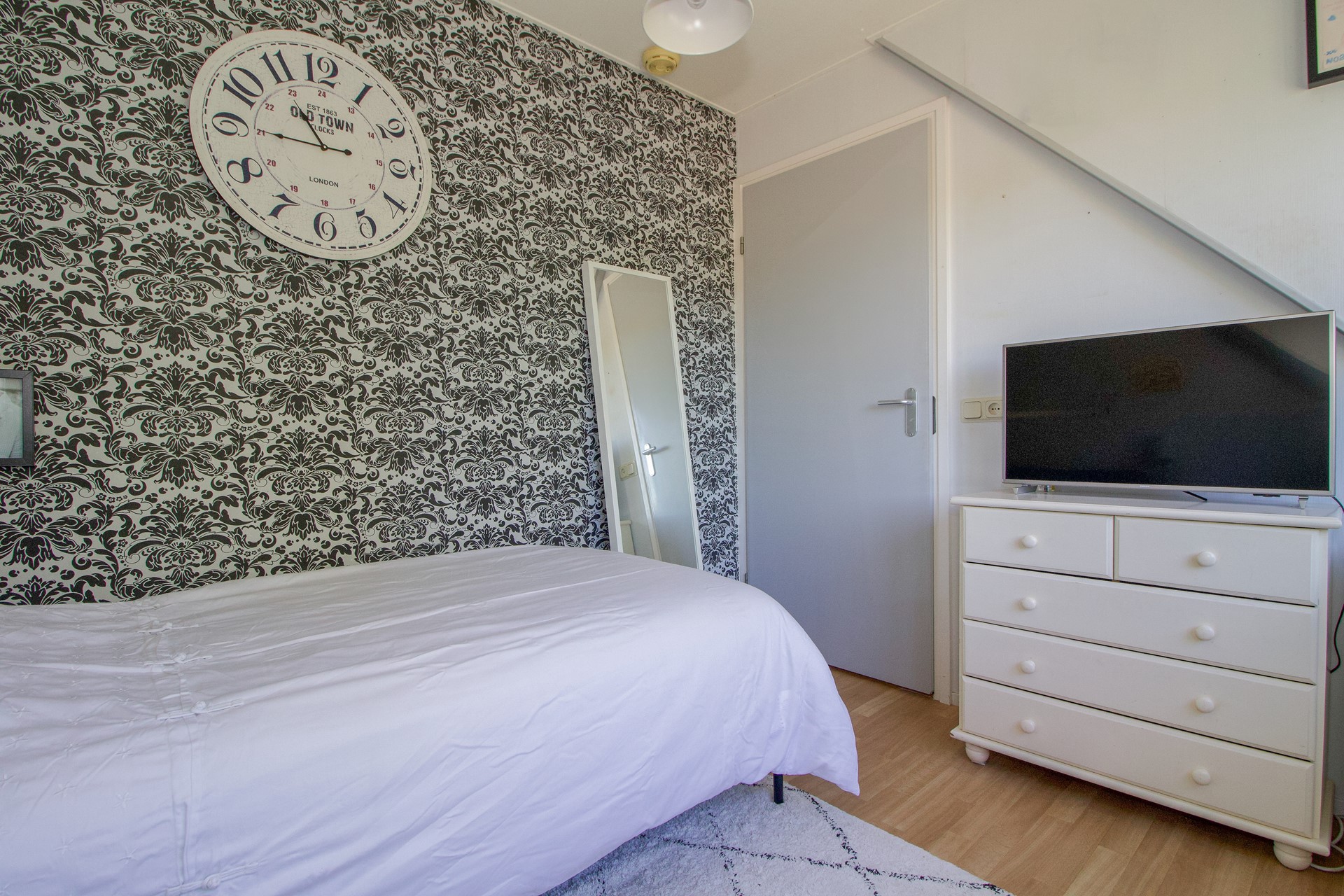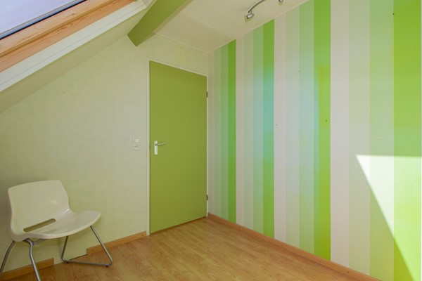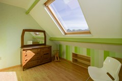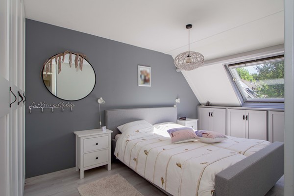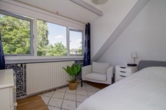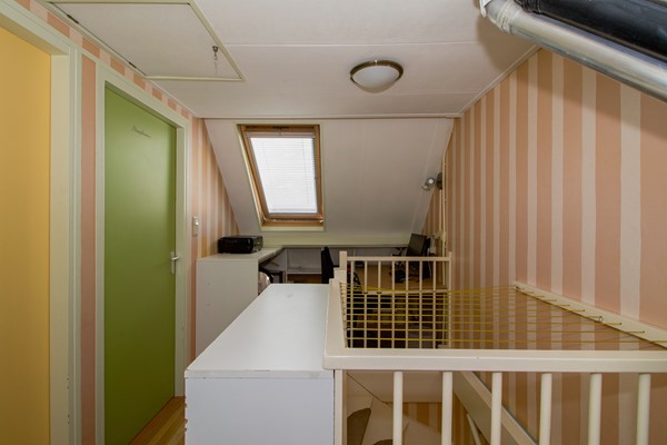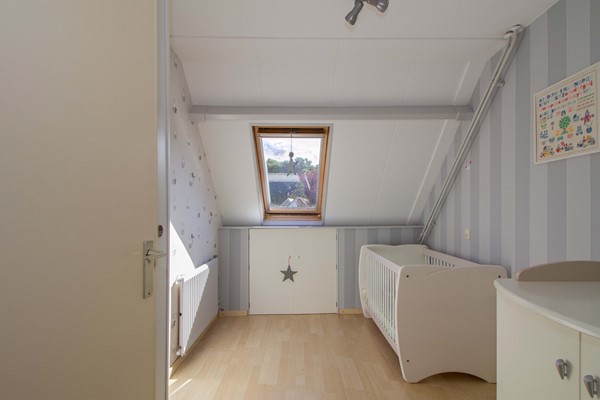 De verdieping beschikt over twee slaapkamers. De voorste slaapkamer is voorzien van een brede dakkapel, waardoor er extra ruimte en veel daglicht ontstaat – een ideale plek voor een comfortabele werk- of slaapkamer. De achterste kamer is eveneens goed bruikbaar als slaap-, hobby- of werkkamer.