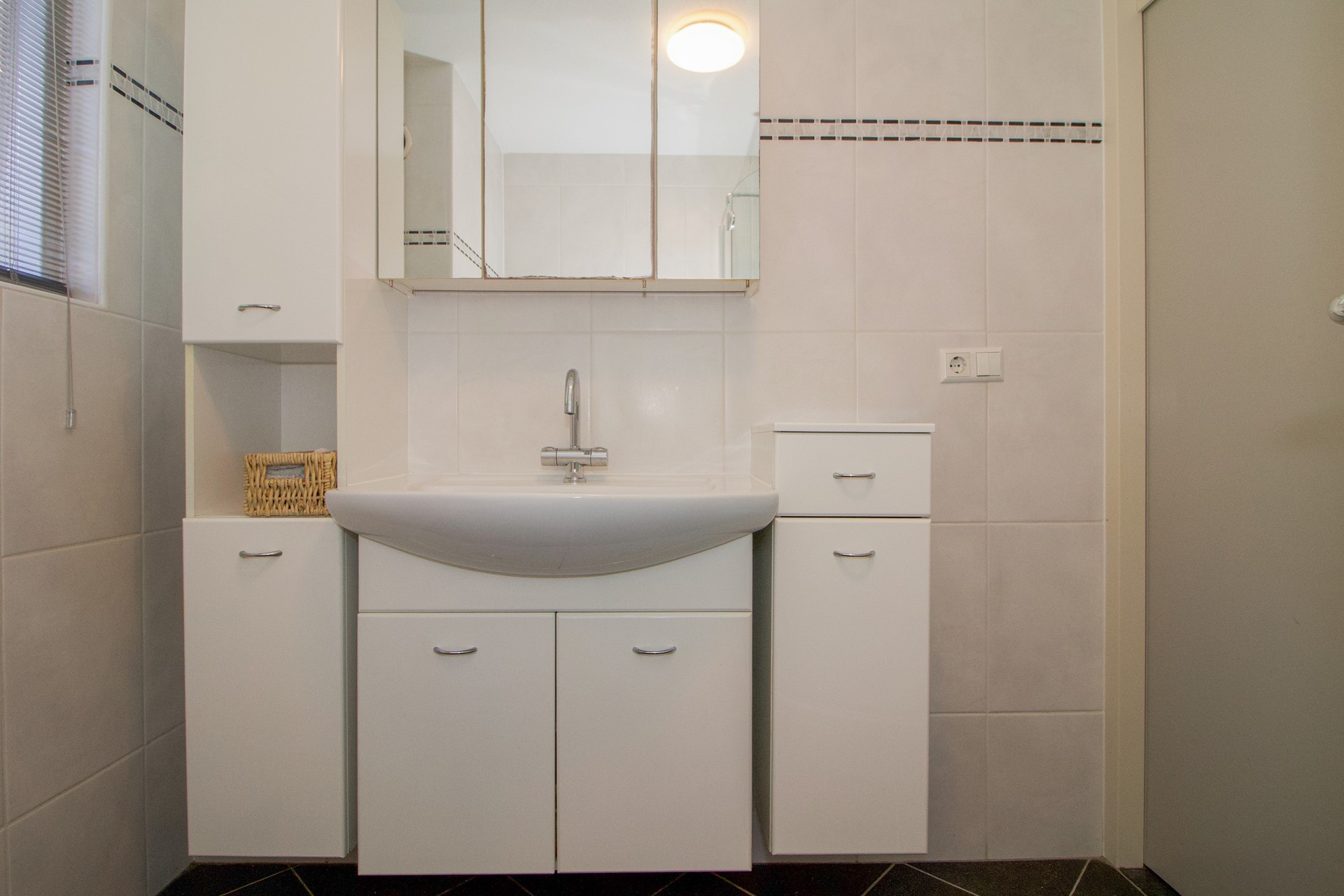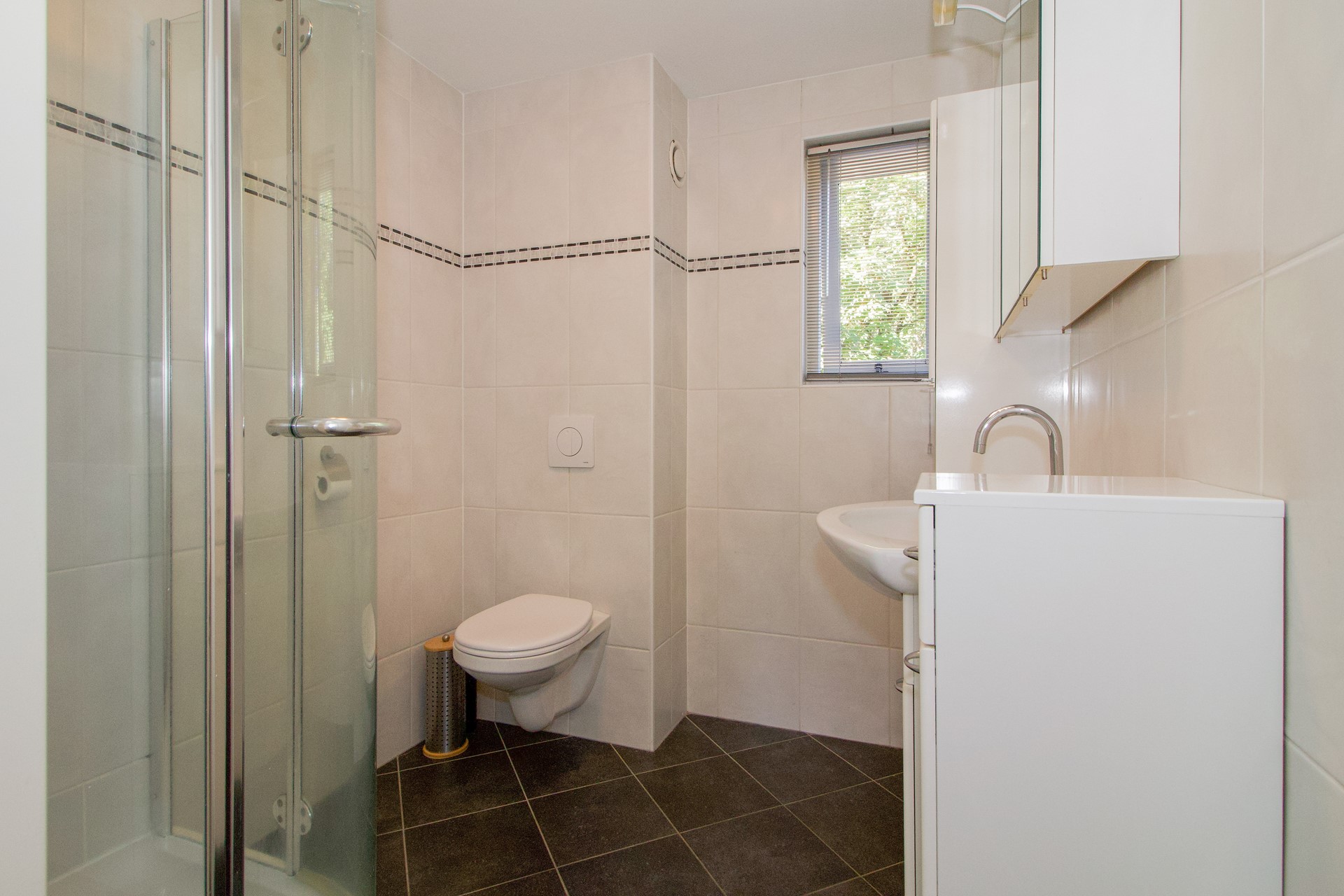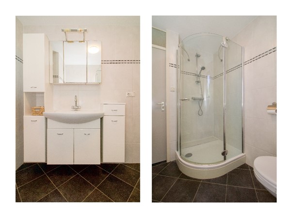 De badkamer bevindt zich aan de voorzijde en is compleet uitgevoerd met een inloopdouche, wastafelmeubel en tweede toilet.