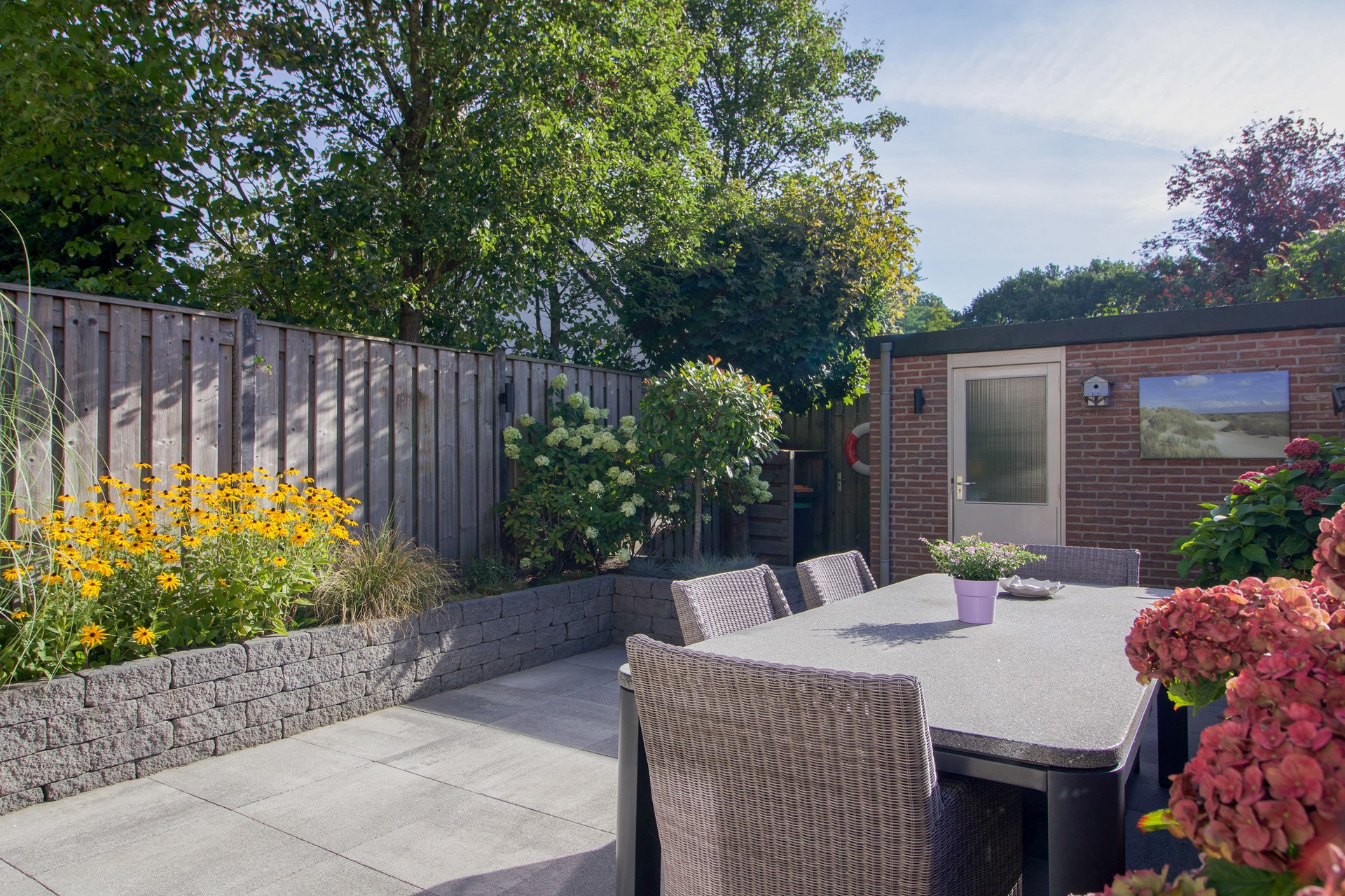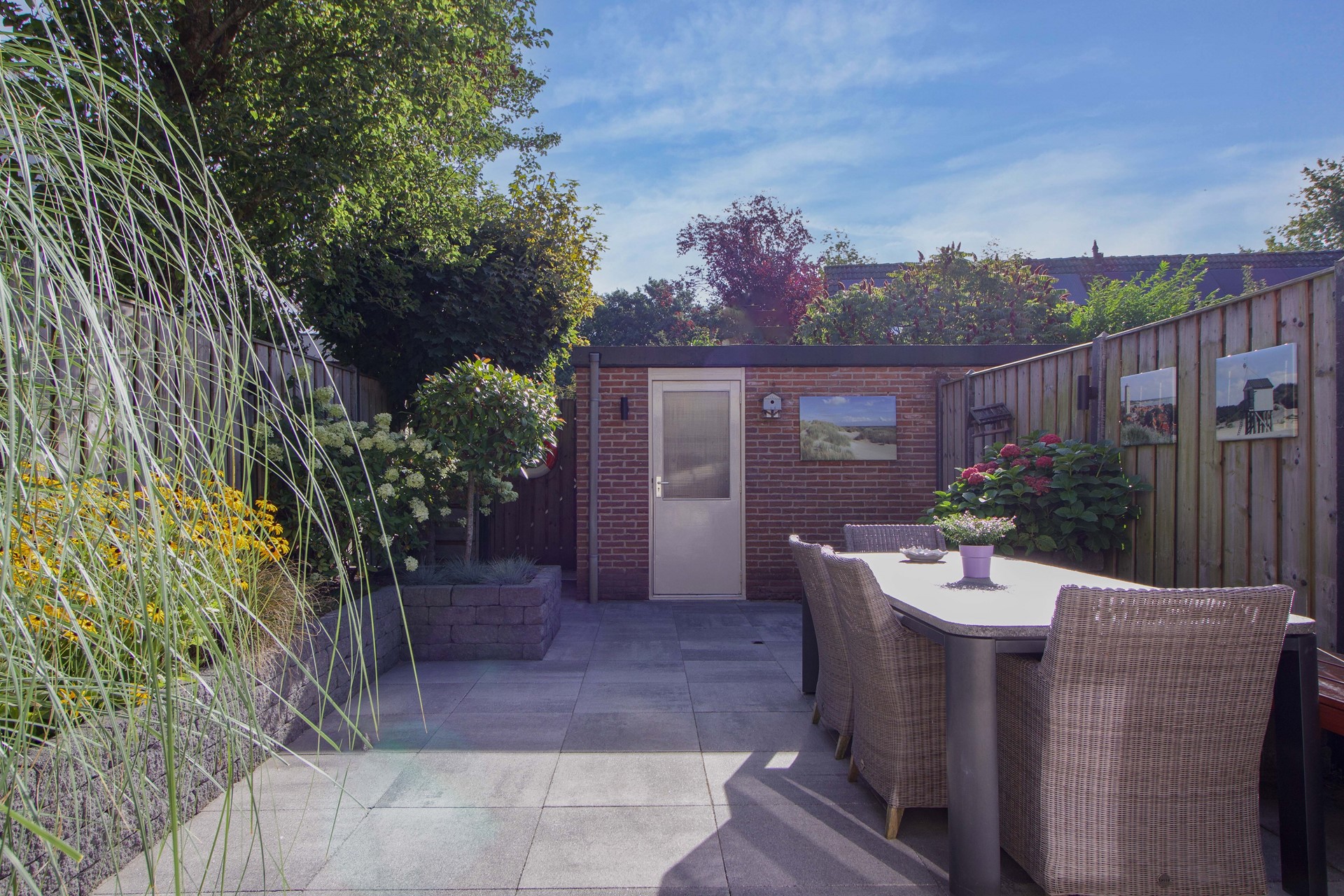 Langs de randen zorgen bloeiende borders met vaste planten en siergrassen voor een kleurrijk geheel en een sfeervolle uitstraling. De houten erfafscheiding biedt veel privacy, zodat je hier in alle rust kunt ontspannen. Achterin de tuin bevindt zich een stenen berging, voorzien van elektra, ideaal voor het opbergen van fietsen, tuingereedschap of tuinmeubilair. Via de achterom is de tuin ook praktisch bereikbaar.